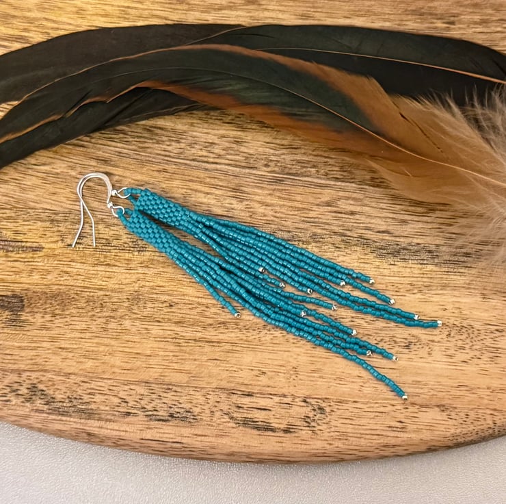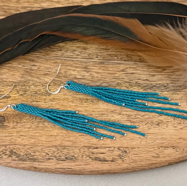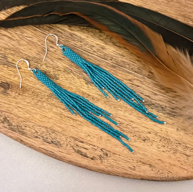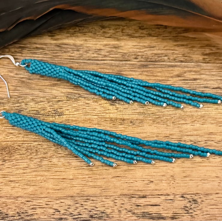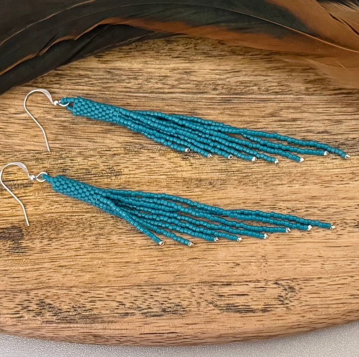 These colour block earrings have been handmade with tiny Miyuki beads in a deep sky blue colour. The beads are hand woven together in a peyote tube at the top and there is a waterfall fringe hanging below in the same blue beads. Each beaded strand is finished with a silver tip at the end.