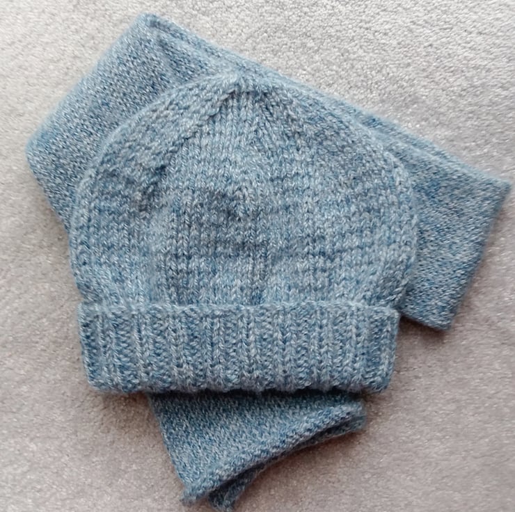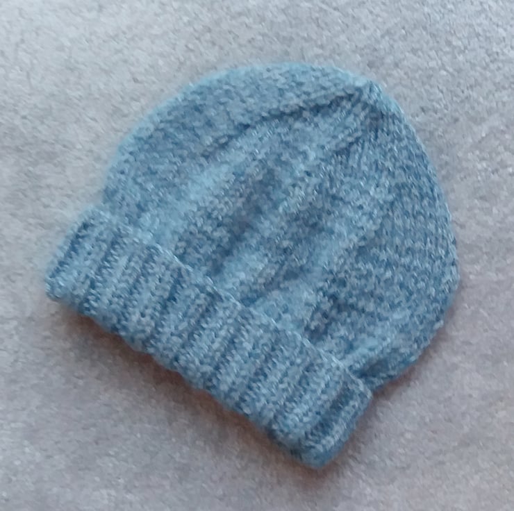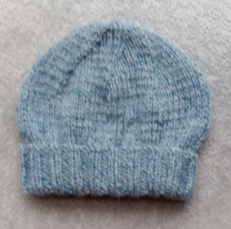To fit a child (adult). Circumference: 57 cm or 22.5 inches. The hat is knitted using double knitting yarn (used double throughout) and 5.5 mm and 6.5 mm knitting needles. The hat is knit flat and seamed or knitted in the round.l
