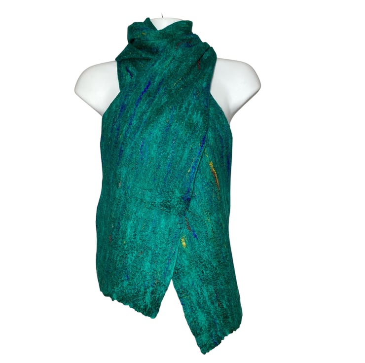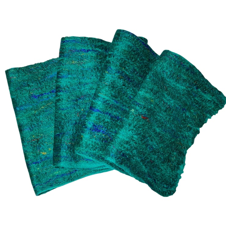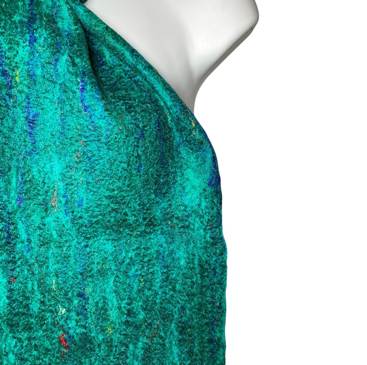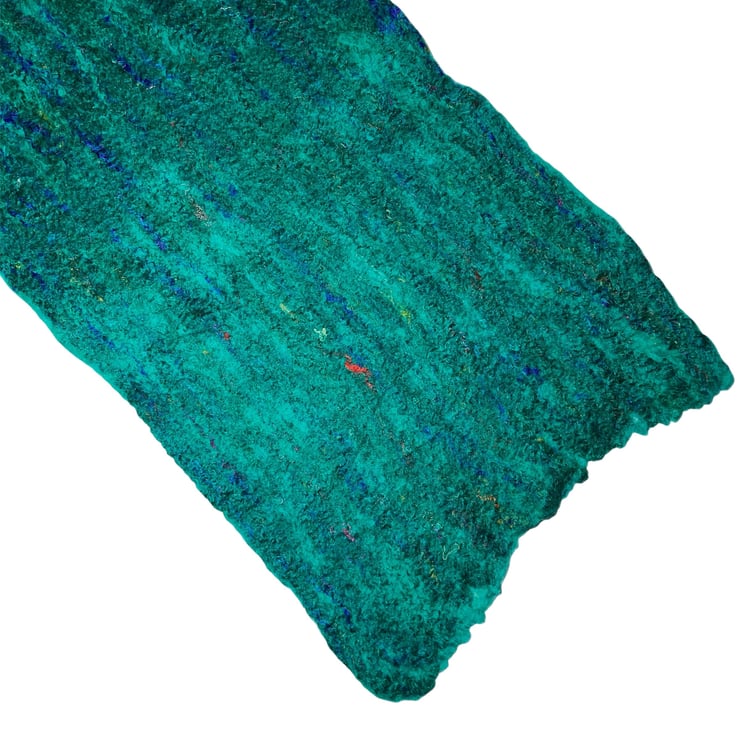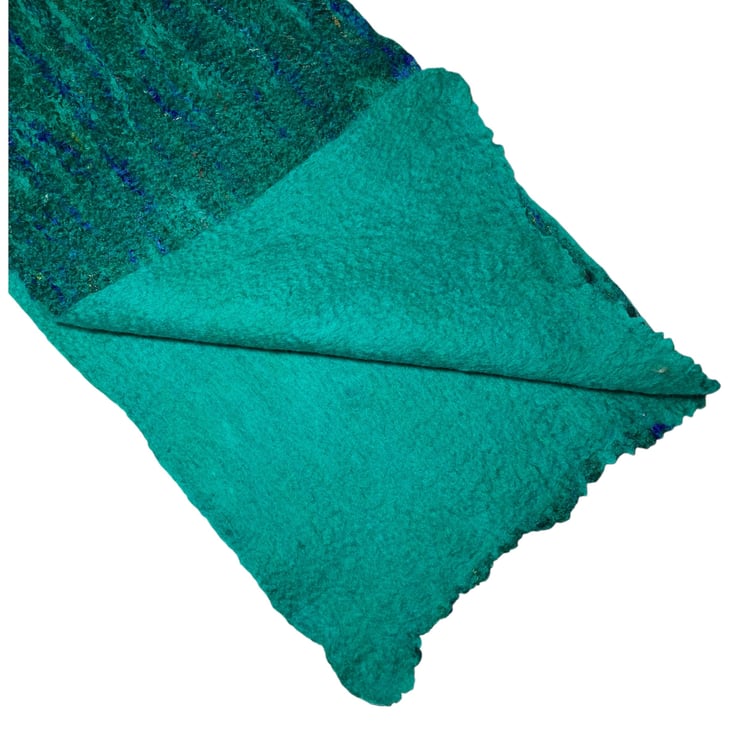 A gorgeous jade coloured merino wool and silk scarf. This scarf has been made using fine layers of jade coloured merino wool fibres topped with a blend of recycled sari silk fibres. The silk fibres have been added to one side of the scarf only, the reverse has been left plain. The scarf has been wet felted which binds the fibres together to create a stable fabric.