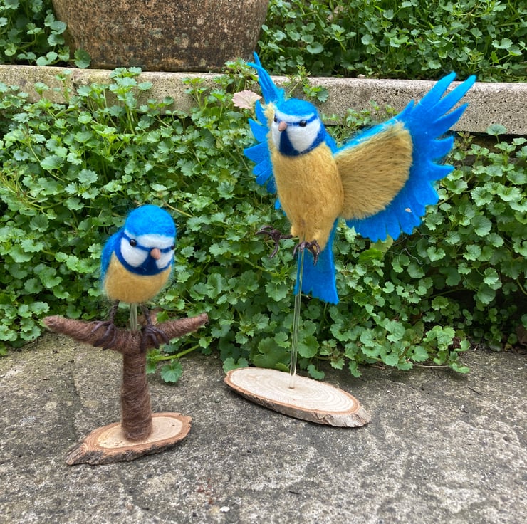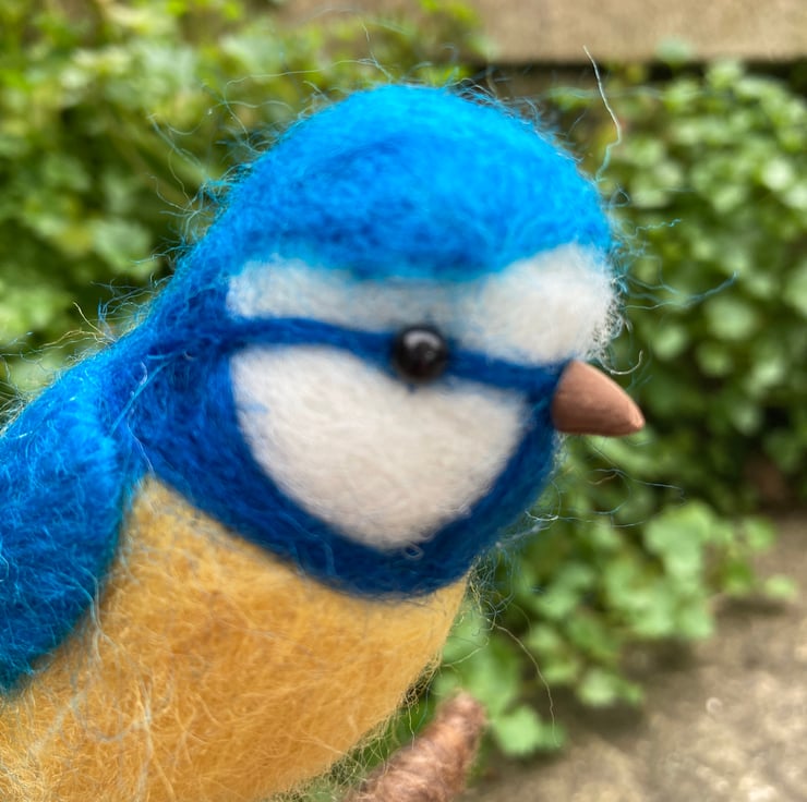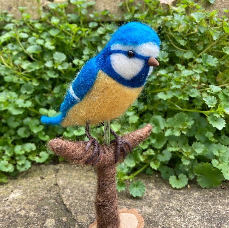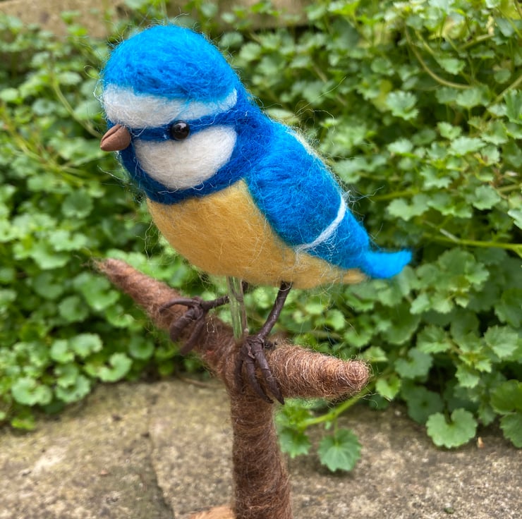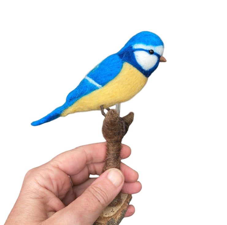 A pretty little blue tit sitting on a branch has been needle felted using woollen fibres. White core wool fibres have been sculpted into shape using a barbed felting needle to bind the fibres together and a top coat of merino wool fibres in appropriate colours has been added. The feet have been made using wired wrapped in brown tape and beaded eyes added. The beak is made using silk clay.