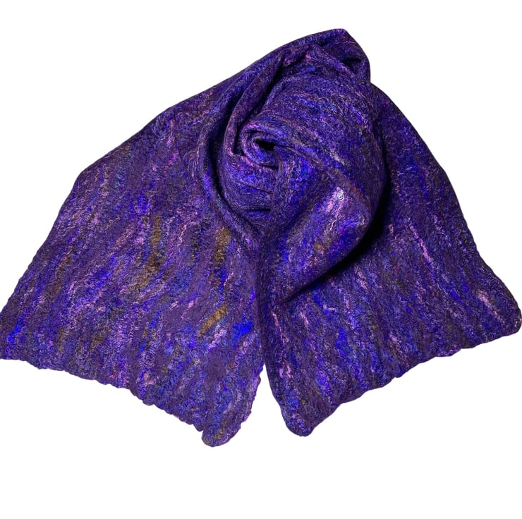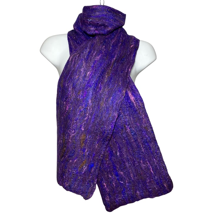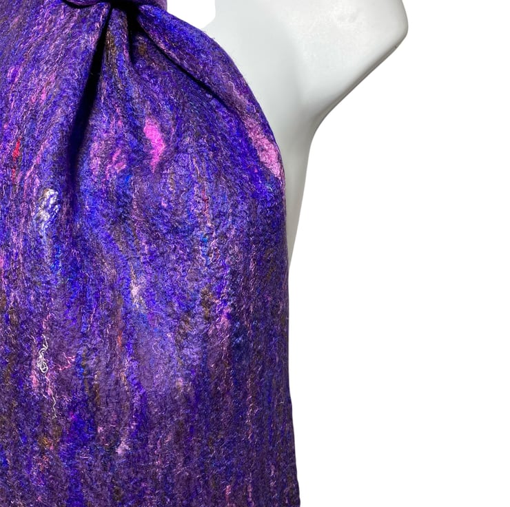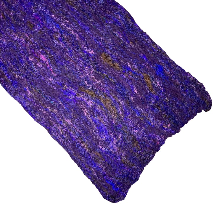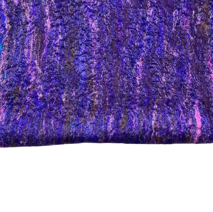 In a deep purple colour with highlights various purple, pink and blue shades, this scarf has been made using soft merino wool fibres and recycled sari silk fibres which add colour, texture and a beautiful sheen to the surface of the scarf. The fibres have been laid out in fine layers and wet felted to bind them together and create a stable fabric. The resulting scarf is soft and lightweight.