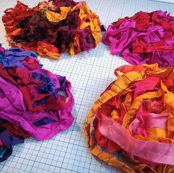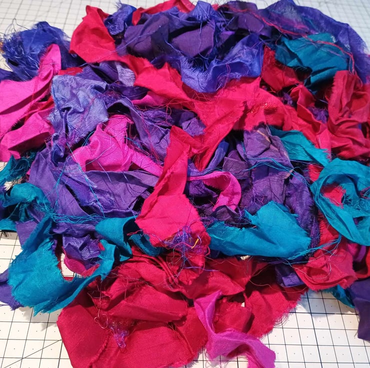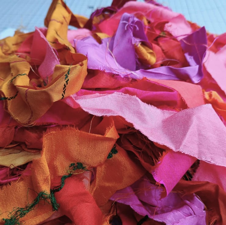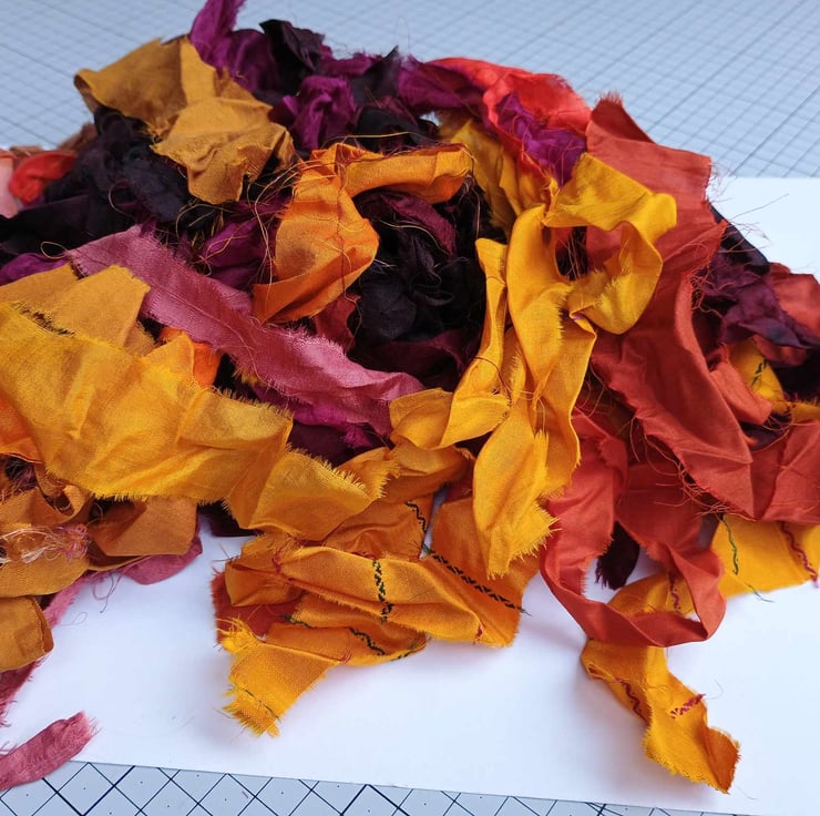 Zero waste recycling from the sari manufacturing industry, I have bundled these lovely silk offcuts (raw-edge ribbons of fabric) into seasonal themes - you can chose from Spring, Summer, Autumn and Winter. Or buy all four with a multi buy discount. Ideal for all sorts of crafts including slow stitching, textile arts, weaving or yarn making.