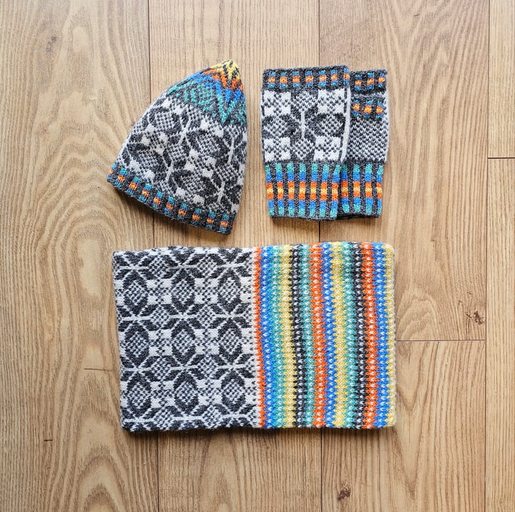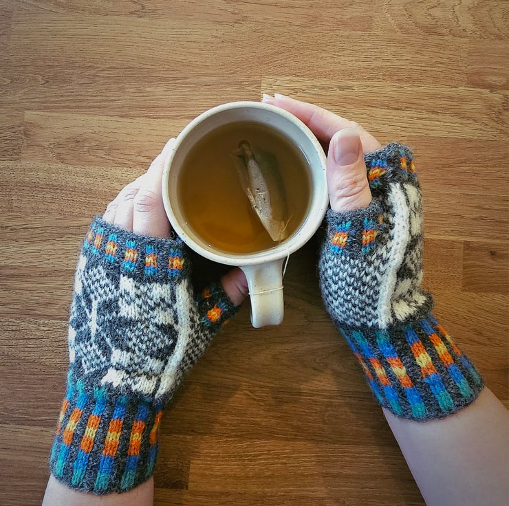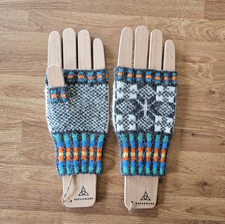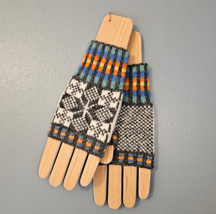 These fingerless mitts are hand knit in 100% Shetland wool using traditional Fair Isle and Nordic techniques. This is my Thora Beth - colour burst design and can be worn as part of a set, along with matching cowl and beanie style hat. If you scroll through the gallery, the set can be seen in the last picture. This listing is for the fingerless mitts alone and does not include the other items of the Thora Beth - colour burst set.