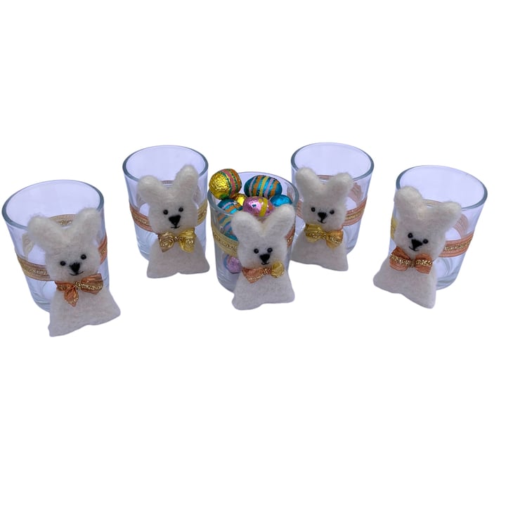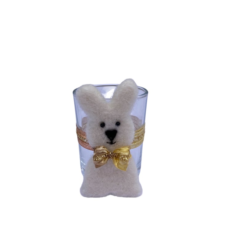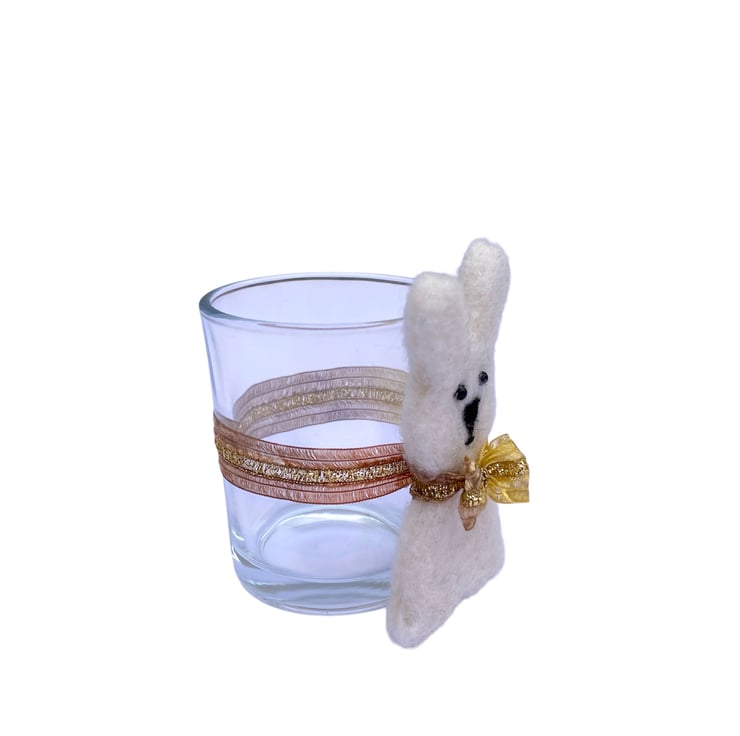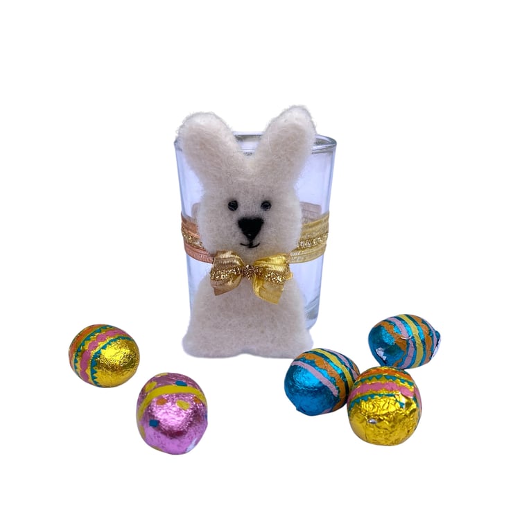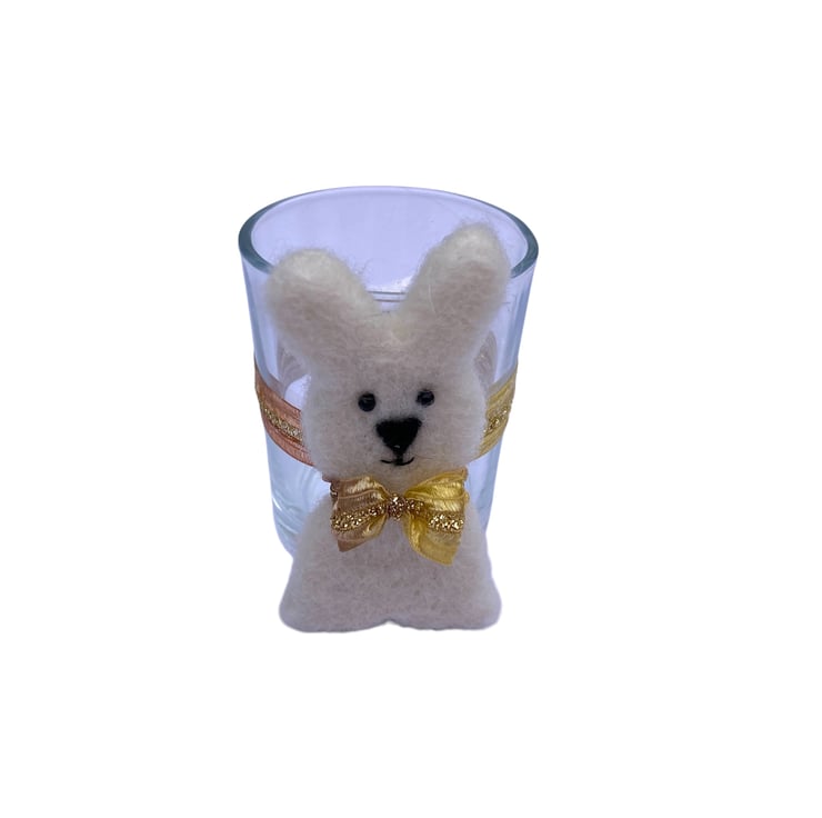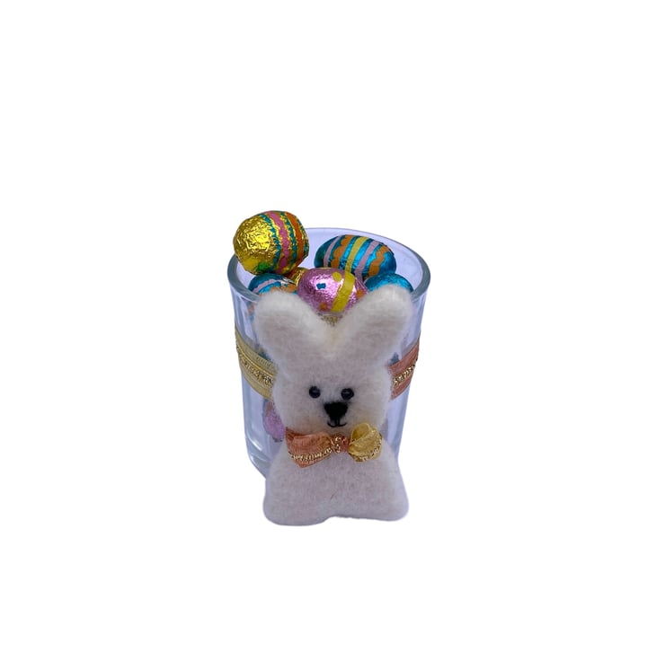 A cute little glass container decorated with an easter bunny ready to fill with easter treats. The glass container is made from clear glass and stands approximately cm tall. The bunny has been needle felted from white woollen fibres, the nose needle felted from black woollen fibres, the mouth stitched and the eyes beaded. A sparkly gold bow has been added around his neck and he is attached to the glass container by means of a matching piece of gold sparkly ribbon. The perfect size to fill with mini eggs or treats of your own choice. Alternatively it could be used as a container for make up, craft supplies or even a small plant.