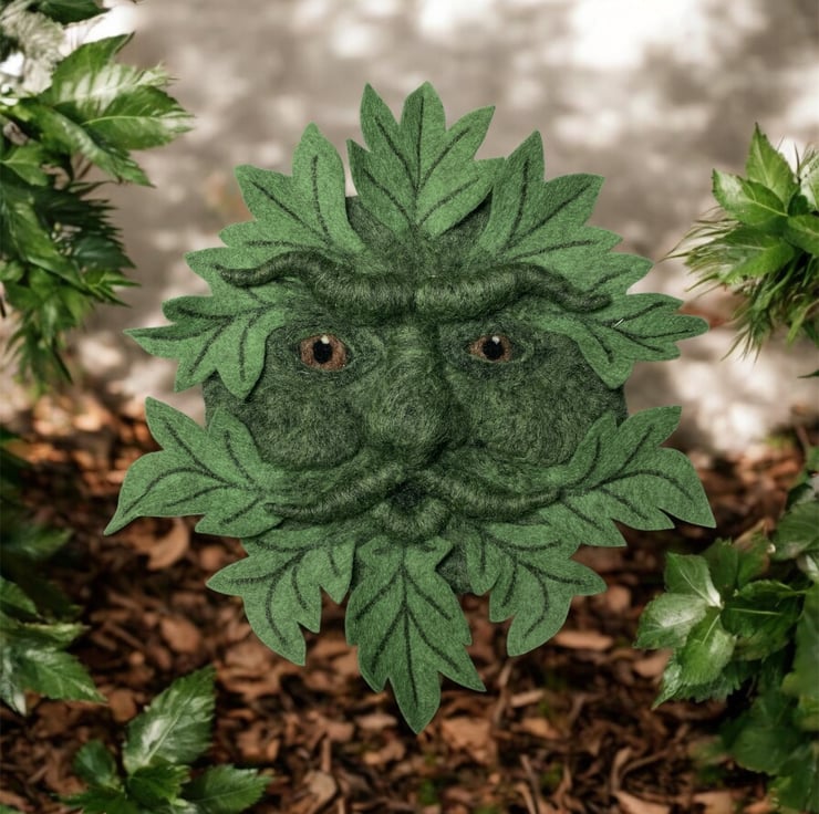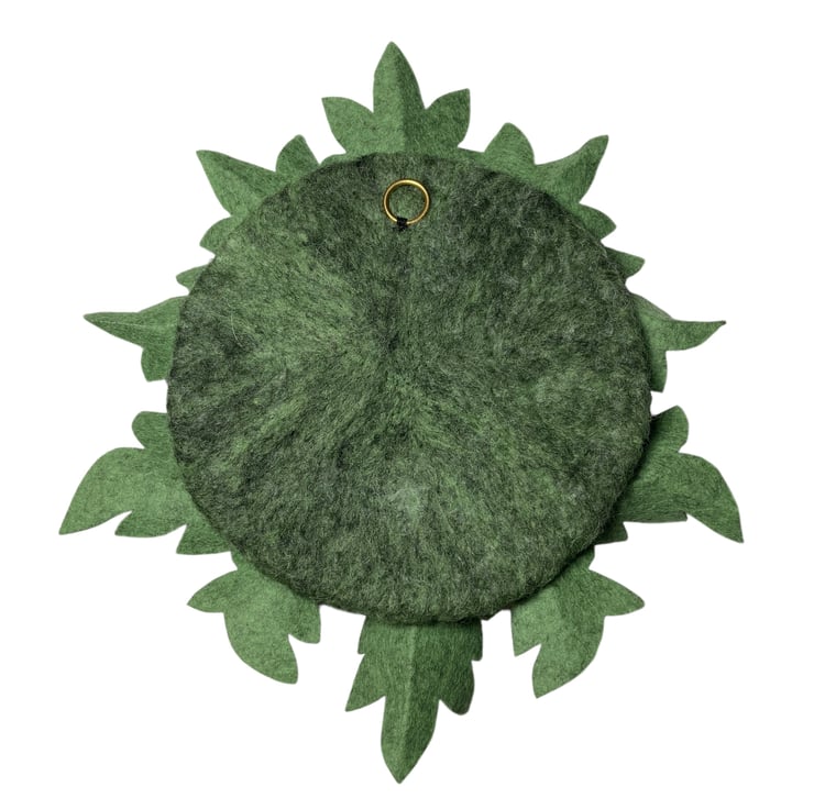 The base and features for this green man are formed by needle felting woollen fibres and sculpting them into shape using a barbed felting needle. The leaves, which are pointed in shape, have been cut from a piece of 100% wool green felt.The markings have been added and they have then been attached around the circumference of the base by needle felting them into position. A small brass ring has been secured to the reverse of the sculpture to facilitate hanging.