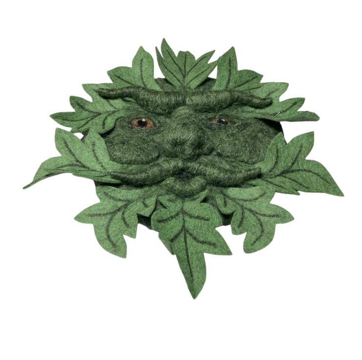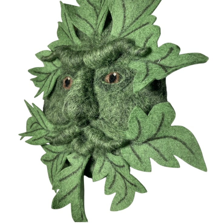 This handsome green man woollen sculpture has been needle felted using green woollen fibres. The leaves are made from 100% wool felt and are slightly lighter green in colour.