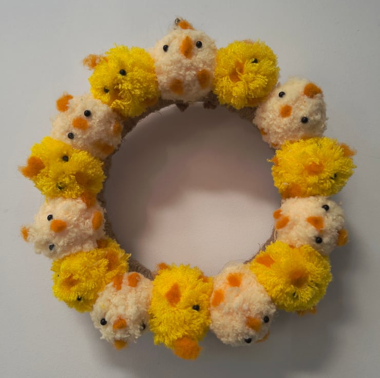 Nothing says Happy Easter like a beautiful pom pom wreath bursting with a chattering of chicks (I looked up the collective noun and a chattering of chicks seems perfect!) Each chick is made from a yellow pom pom and a beak, a comb and feet, along with its beady black eyes have been added to each one to give it a cheeky personality.