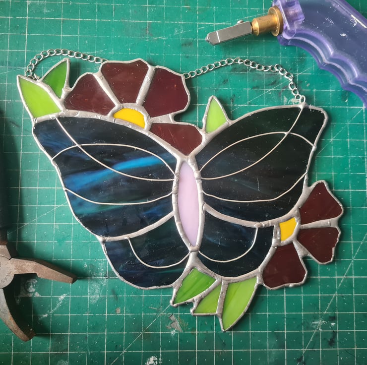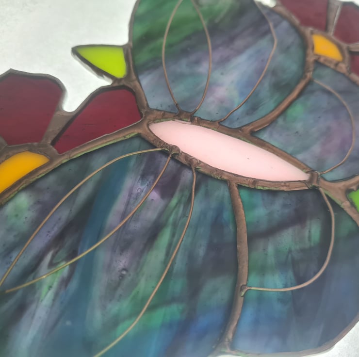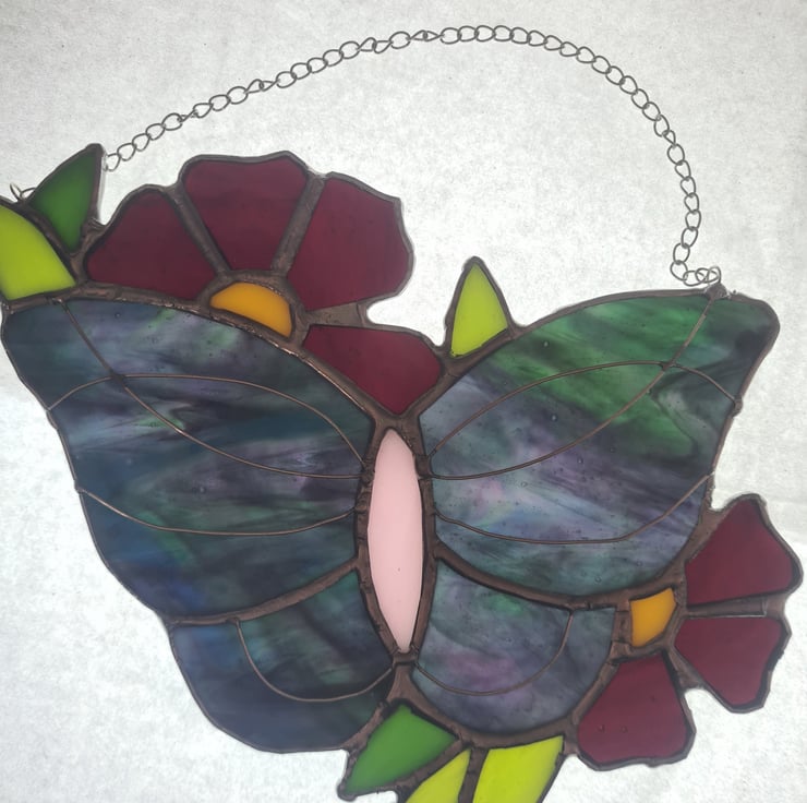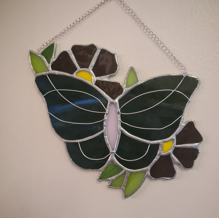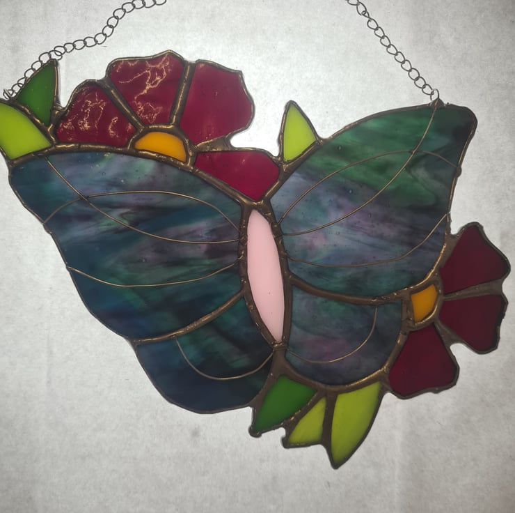 This summer vibes stained glass butterfly is made with some beautiful glass that really needs the sunlight to show itself off! Wire detailing adds another level of interest to an already stunning piece! Made using the Tiffany method it is delicate to look at but made to last and will enchant you for years to come! Measures 15x15cm approximately and come with a hanging chain and standard suction cup.