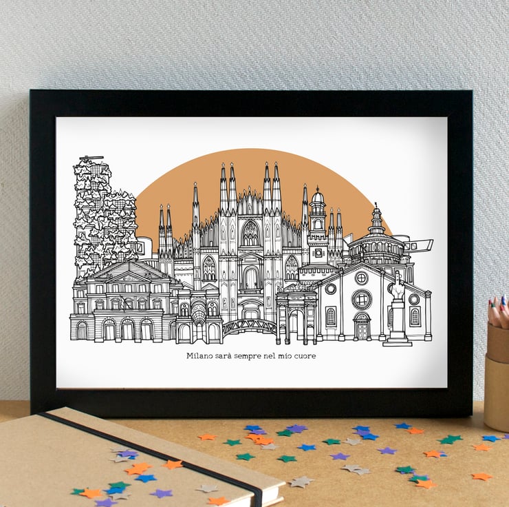 The illustration was drawn using pen and ink, by hand, and has then been digitally manipulated to come up with the final image. It features La Scala, Galleria Vittorio Emanuale II, Ponte Alda Merini, Arco della Pace, Basilica di Santa Maria della Grazie (home to the mural of The Last Supper by Leonardo da Vinci), Castello Sforzesco, Il Duomo, Il Bosco Verticale (the Vertical Forest buildings), and a little Il Dito (aka L.O.V.E.) sculpture. If you look carefully you'll also spot San Siro Stadium peeking out in the background.