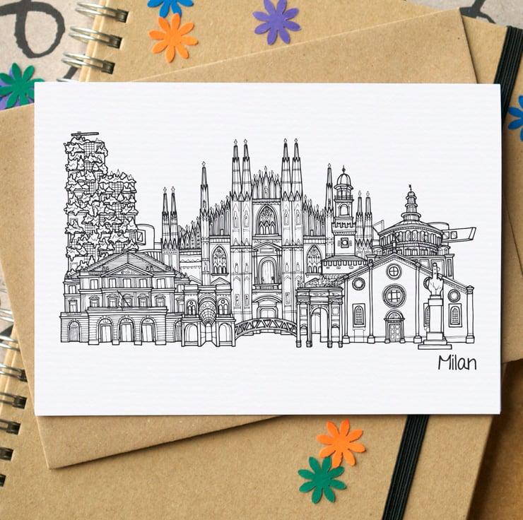 A simple blank card featuring a skyline illustration of some of Milan's greatest landmarks.
