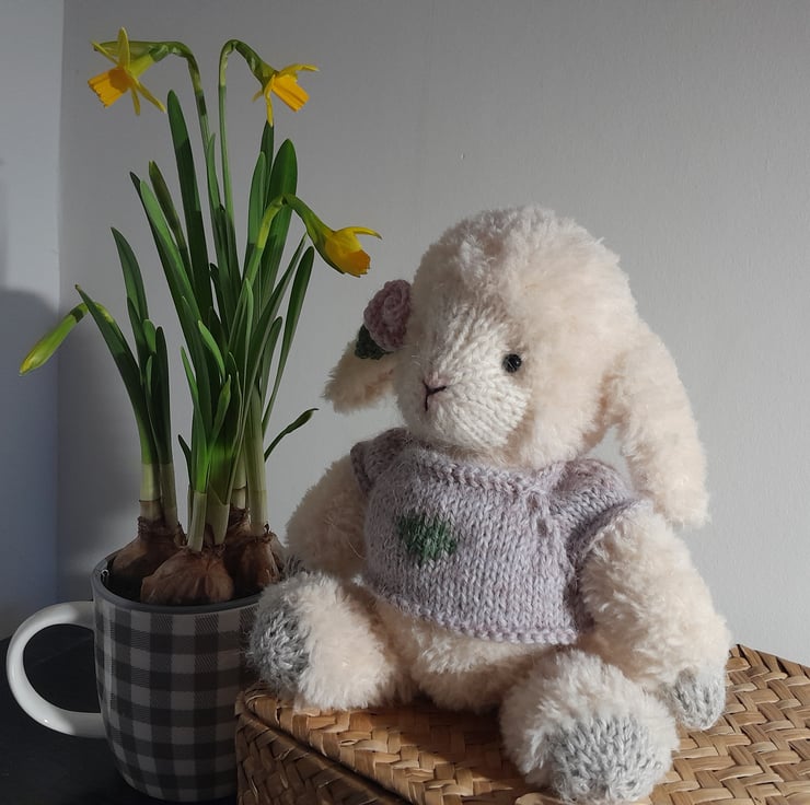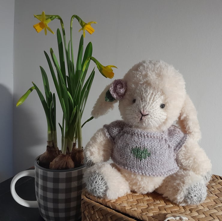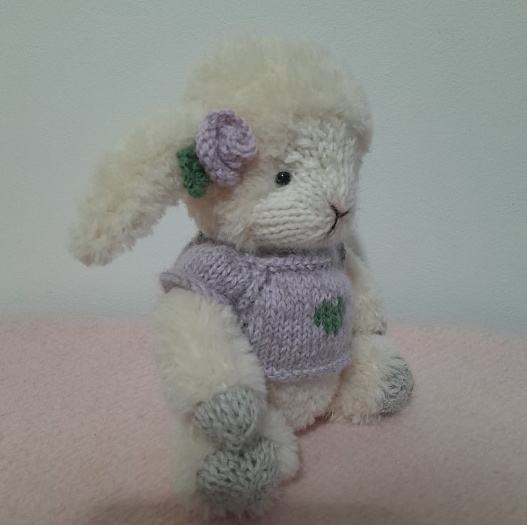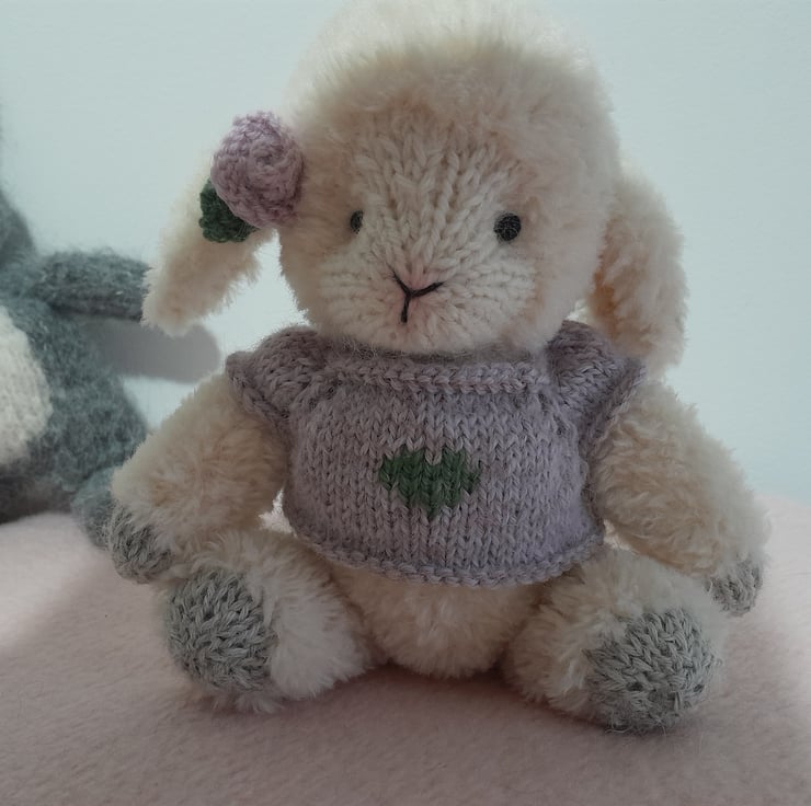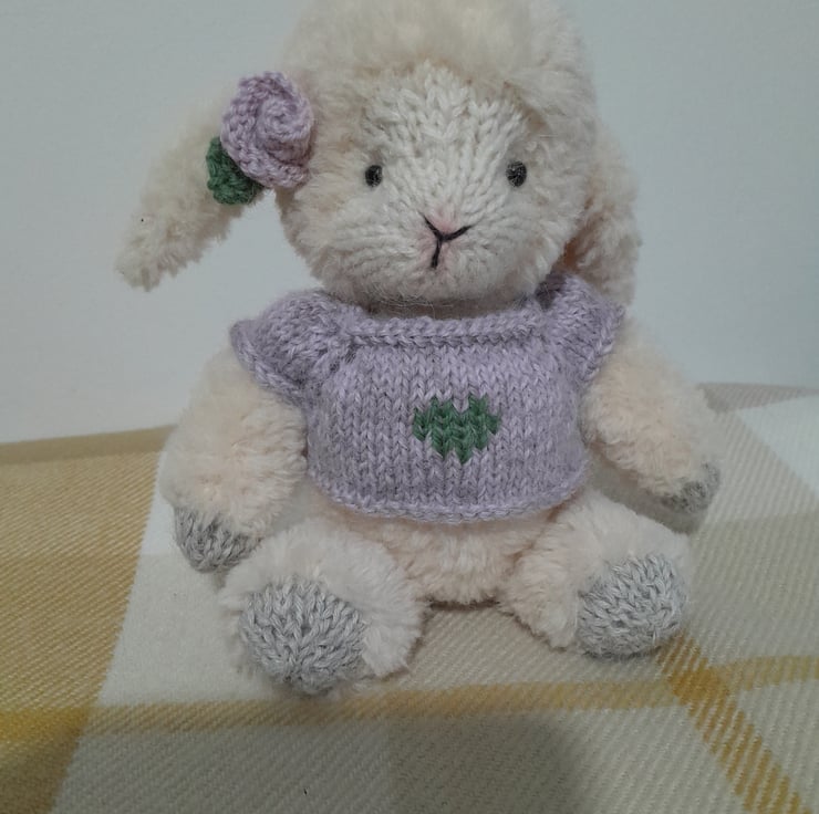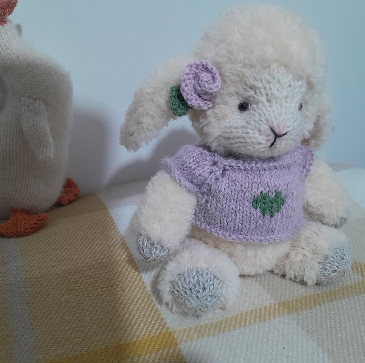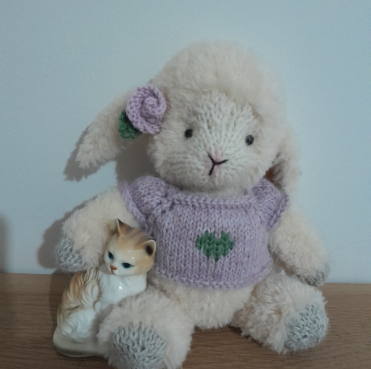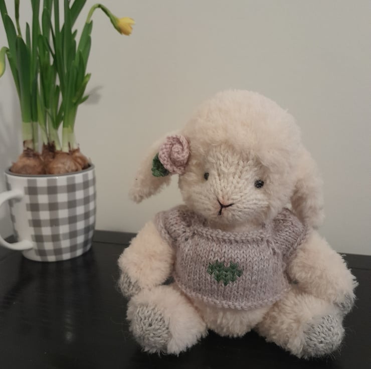 Spring is still someway off but this little one is all ready for when the sun feels warm once again. Little lamb measures 7" ( 18cm) sitting. She is knitted in a beautifully soft yarn called Peter Pan Precious - such a fitting name for this little lamb. Her sweet lavender top is made in a fine merino yarn and embroidered with a leaf green heart. She wears a pale lilac flower tucked in her fleecy ear. She would be a perfect gift for a special occasion or just for yourself to herald the start of the spring season.