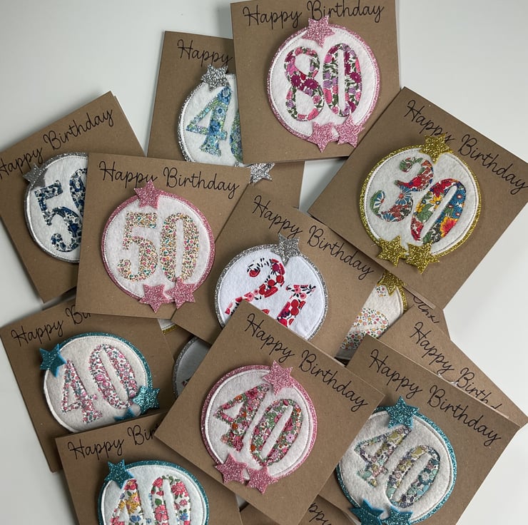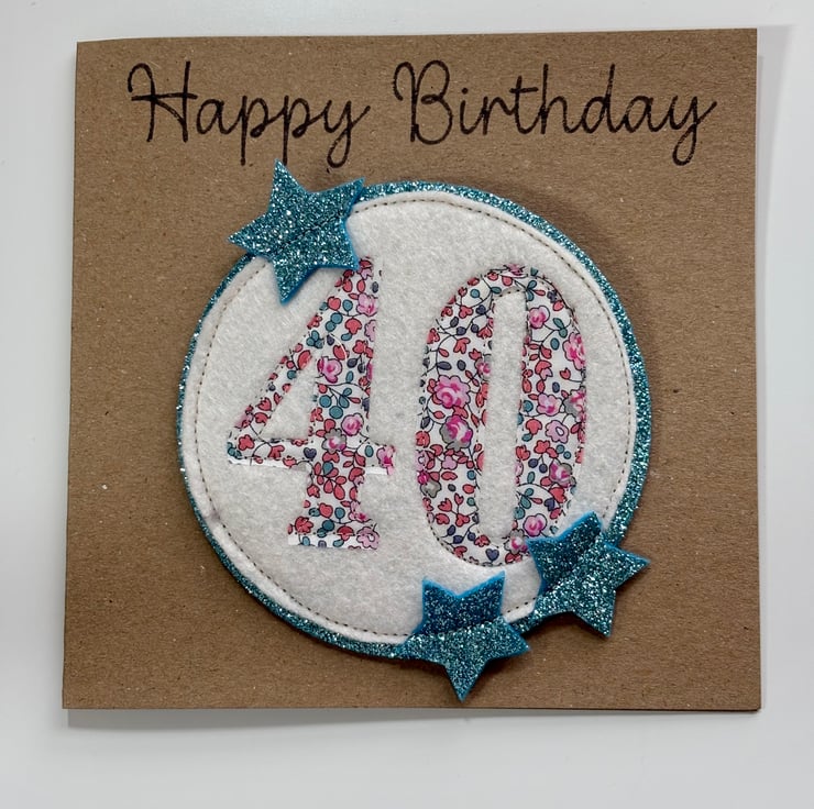 Made using pretty Liberty print fabric the number 40 is stitched on to a cream felt circle. This has then been further stitched onto turquoise glitter felt for some added birthday razzmatazz! Some little glitzy stars set it off perfectly.