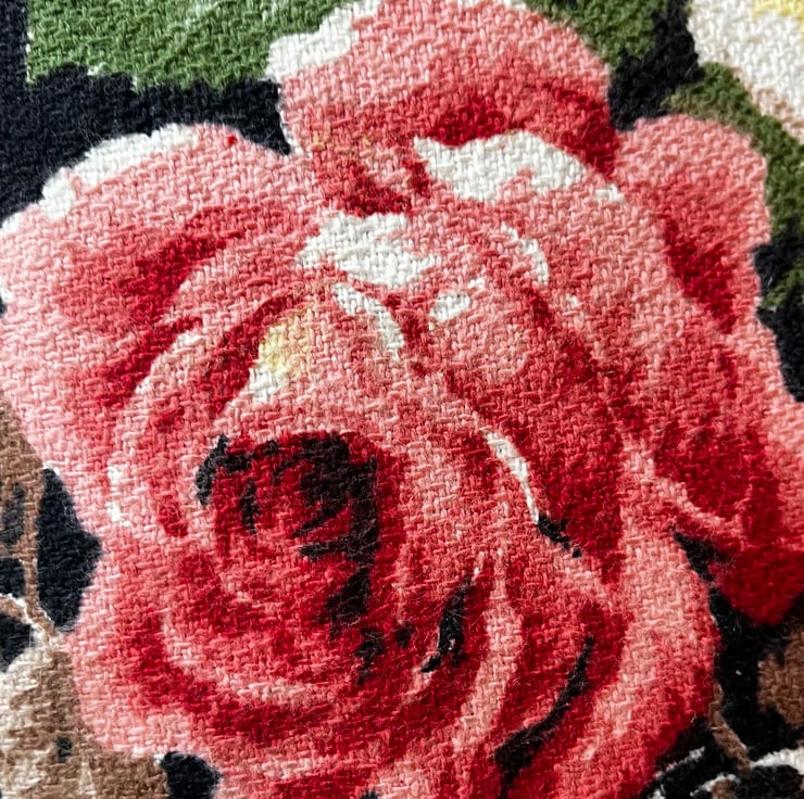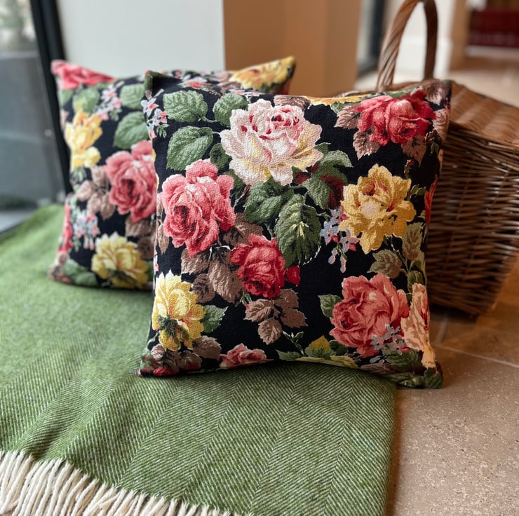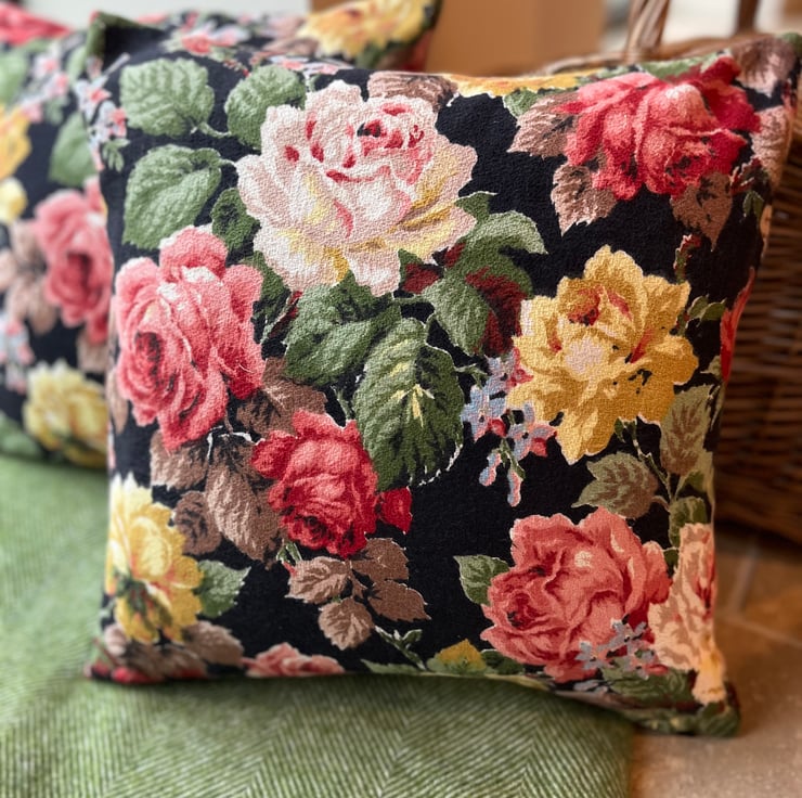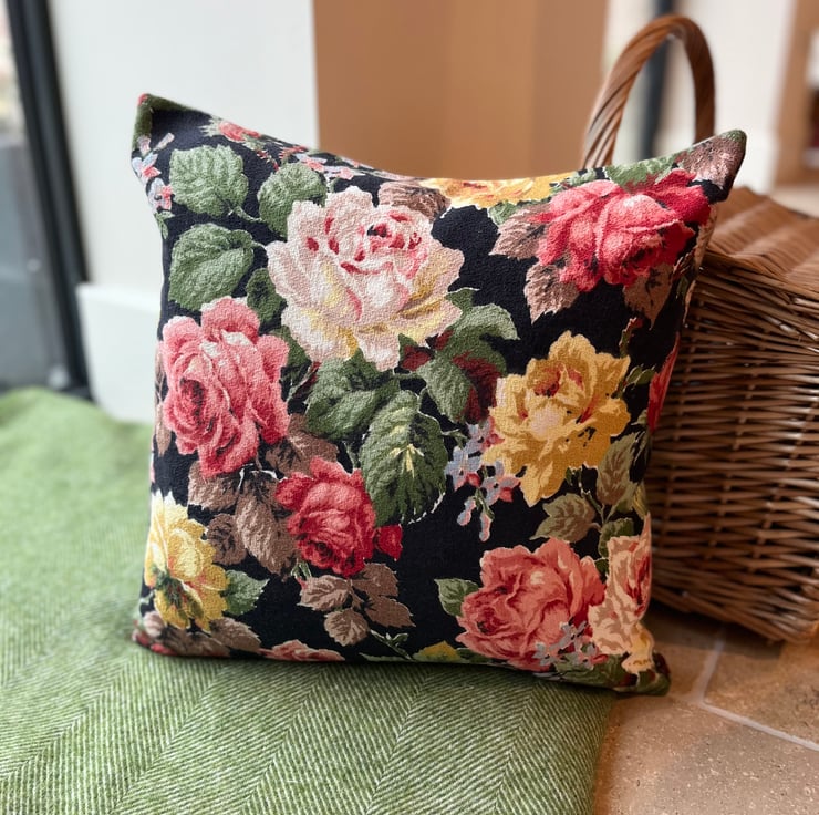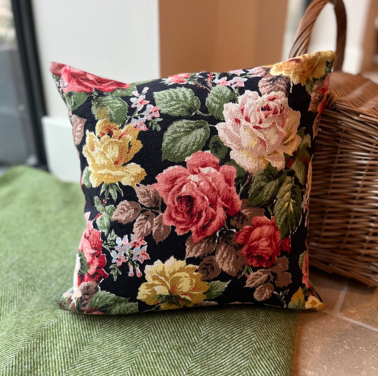 Vibrant vintage barkcloth cushion cover with a colourful rose design on a black background. The cover is backed with pistachio thick cotton.