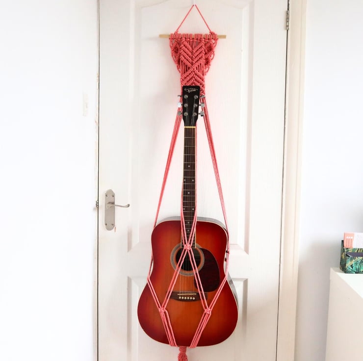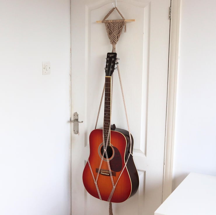 The macrame guitar hanger is the ultimate guitar mount which only requires a simple guitar wall hook such as a nail to hang it from.