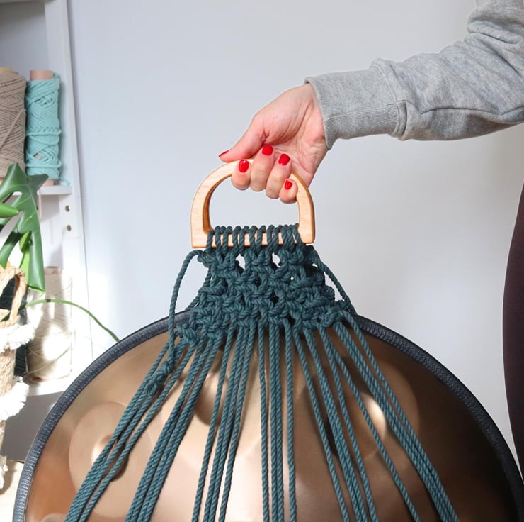 You secure the handpan in the hanger with tying double knots on each side of the wooden handles, easy peasy!