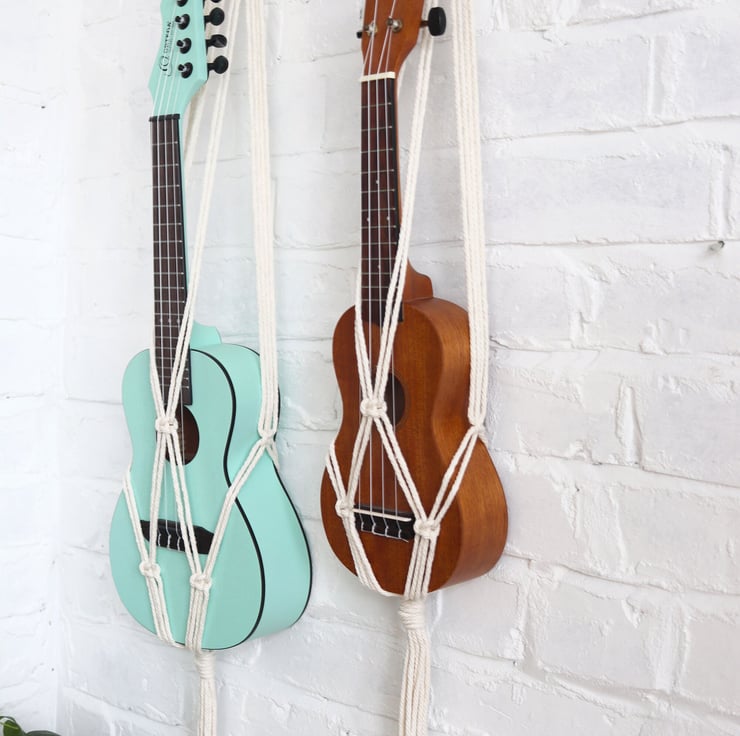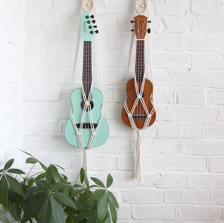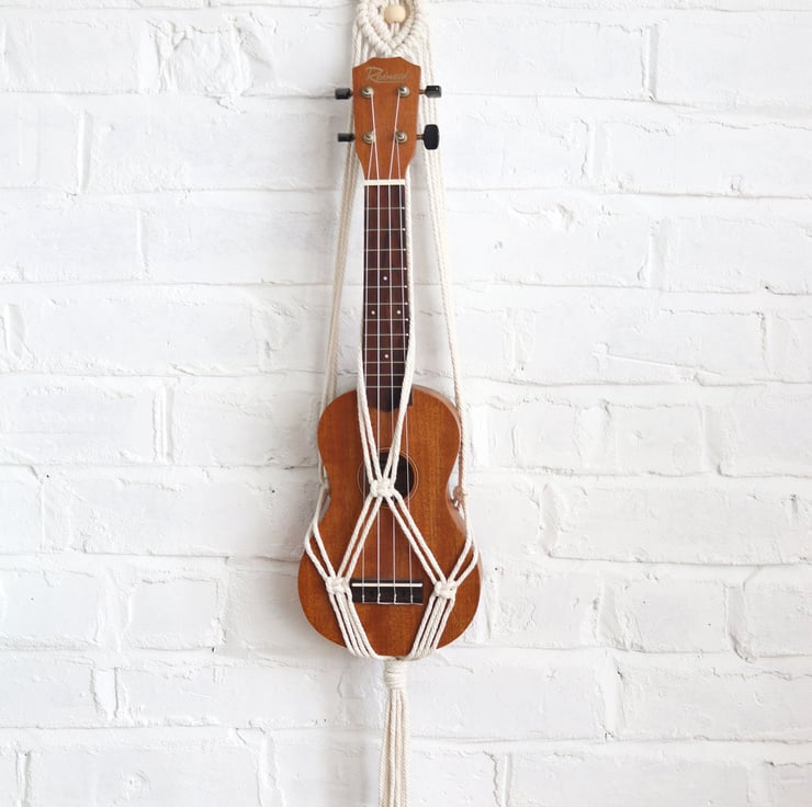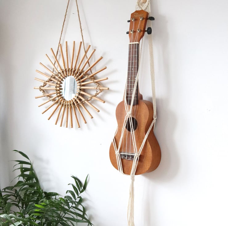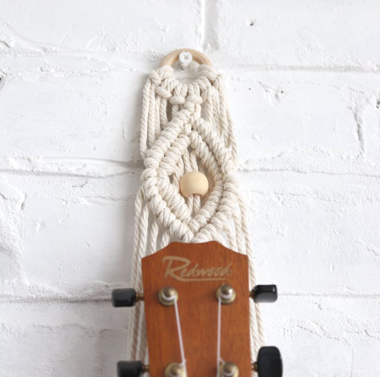 Macrame Ukulele Wall Hanger Mount with strong bamboo hoop and wooden bead with recycled cotton rope - made by a professional musician.