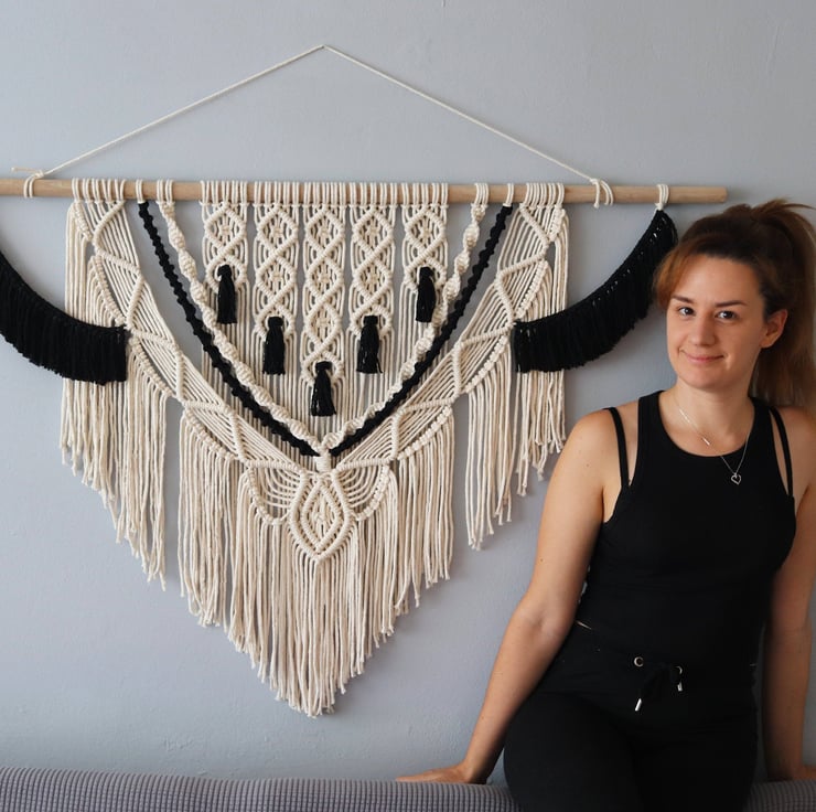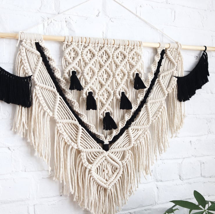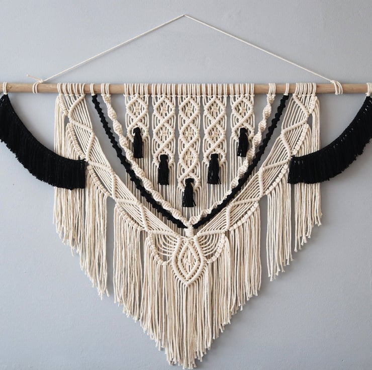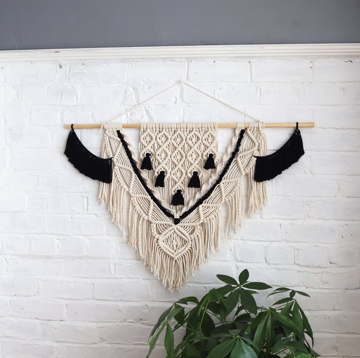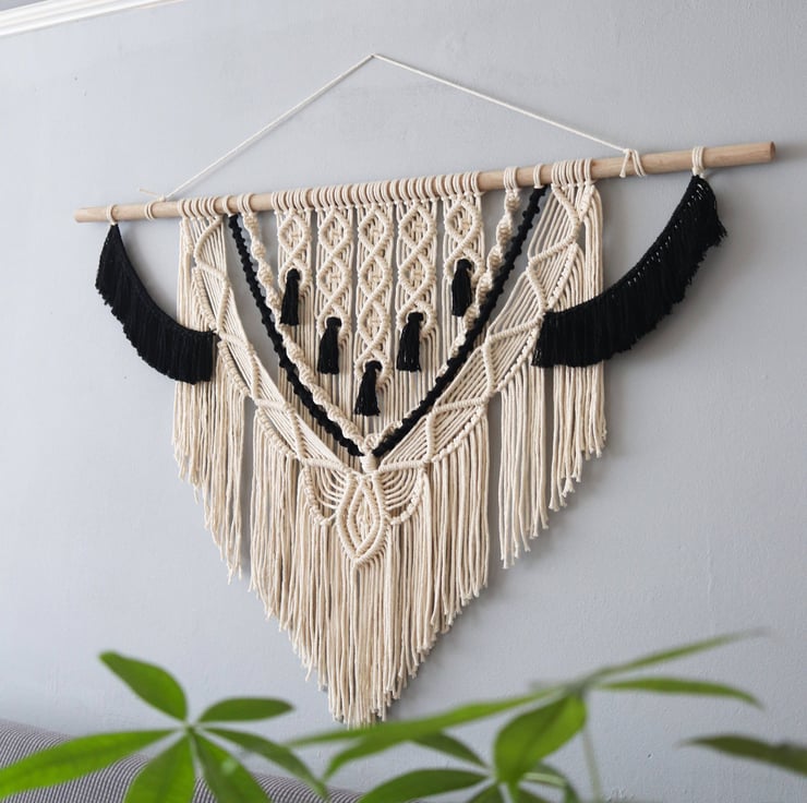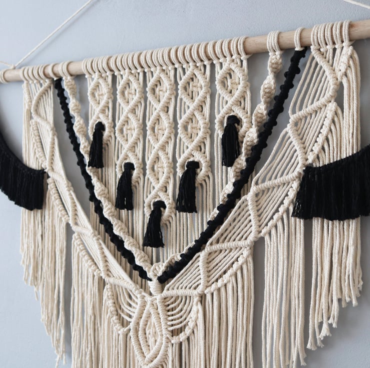 Large Macrame Black and White Wall Hanging with thick hardwood support (included with the hanging) 'Courtney'