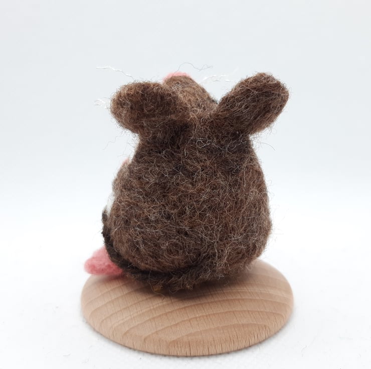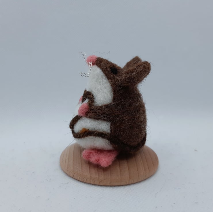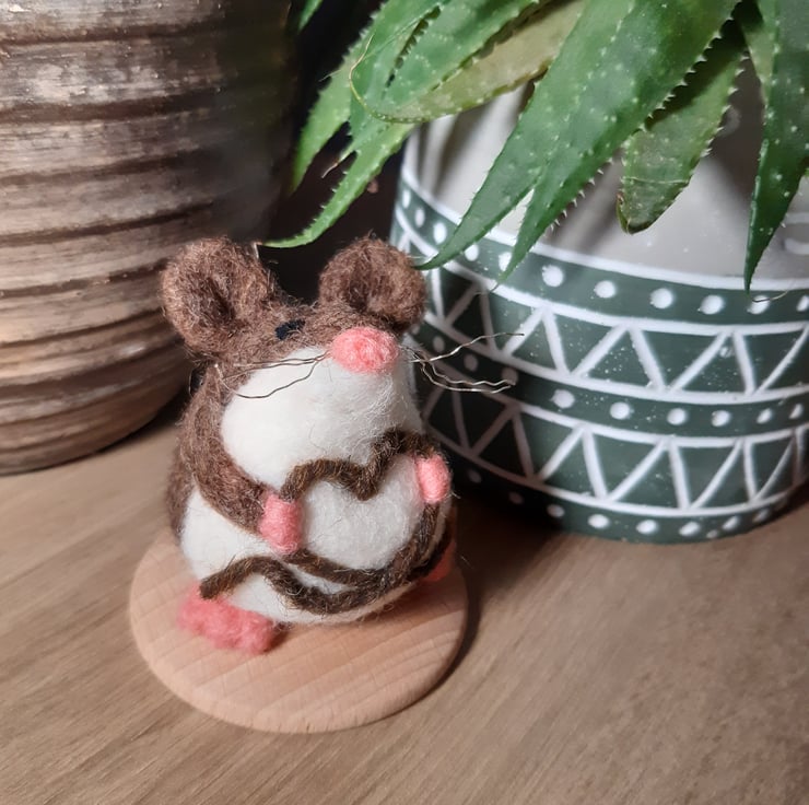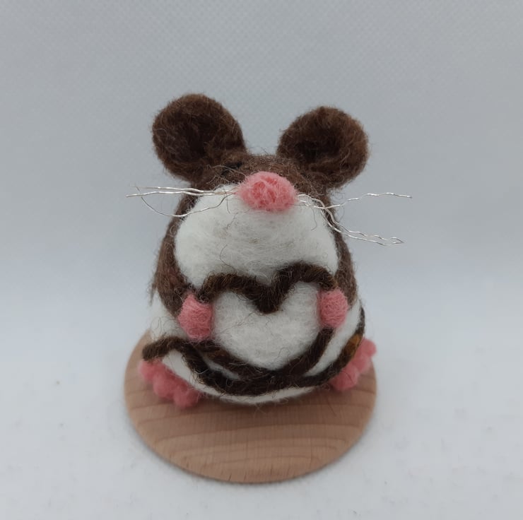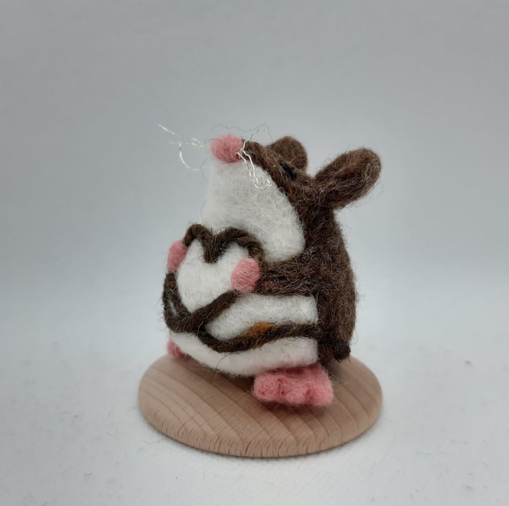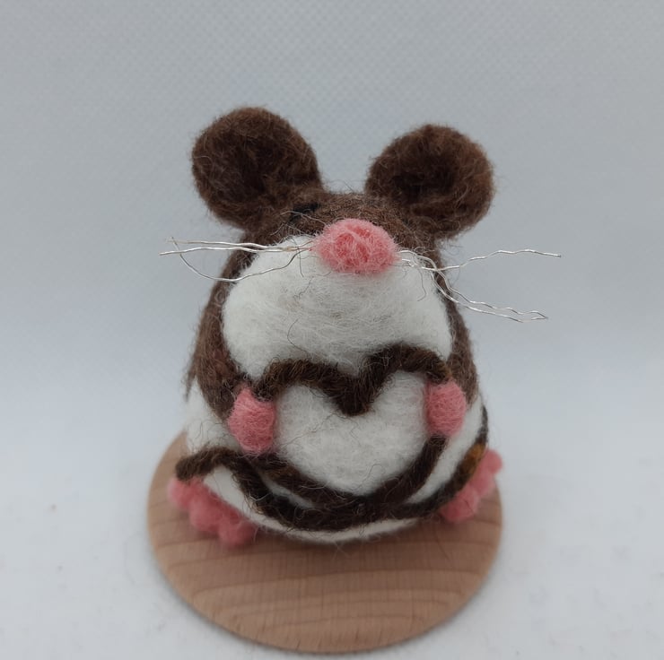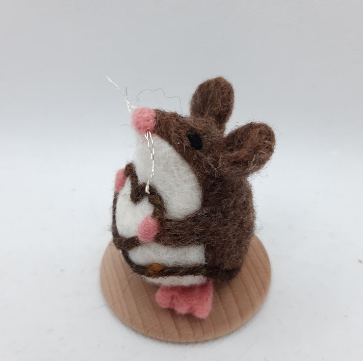 Cute needle felted brown rat ornament with heart curled tail, wire whiskers and a wooden base.