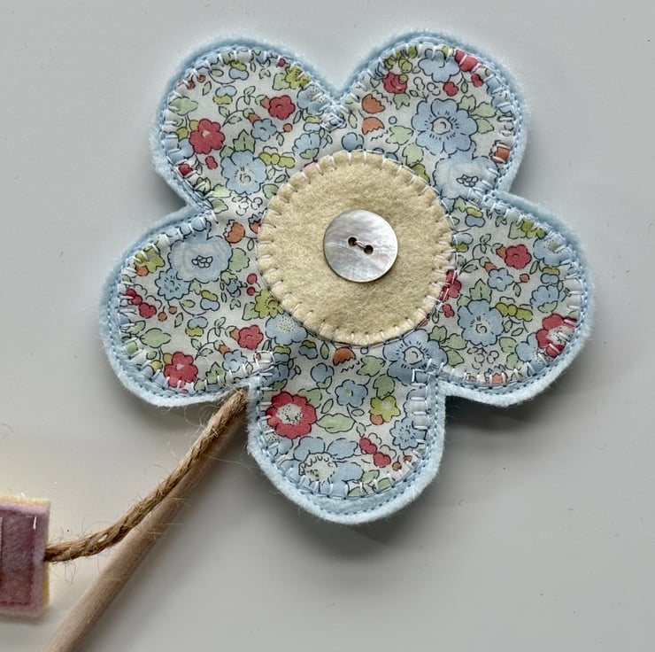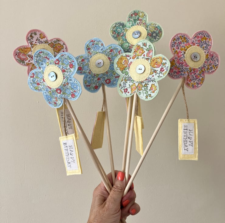 A pretty felt and fabric flower on a stick. This handmade item makes the perfect birthday gift as it comes with a hanging tag bearing the words Happy Birthday.