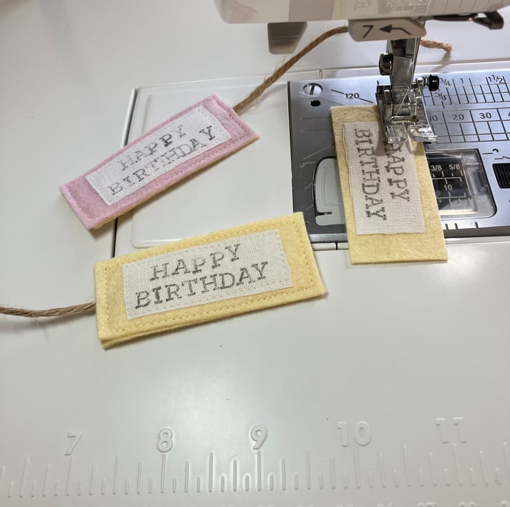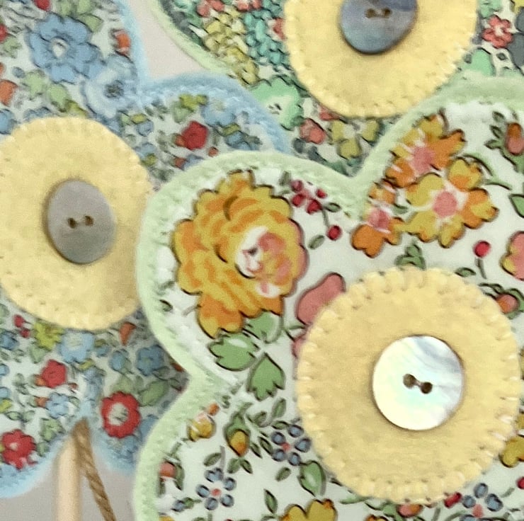 The flower has a background of pastel felt with a pretty Liberty print fabric body. A pastel felt circle and a lovely shell button sit in the centre. The tag has the words Happy Birthday printed on white cotton which has a pastel felt backing.
