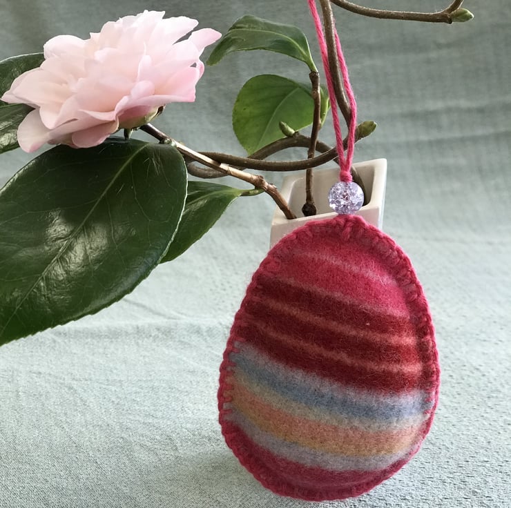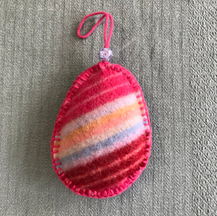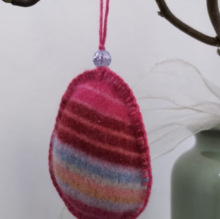 Easter decoration made from an upcycled jumper, filled with wool and hand blanket stitched. Finished with a glass bead.