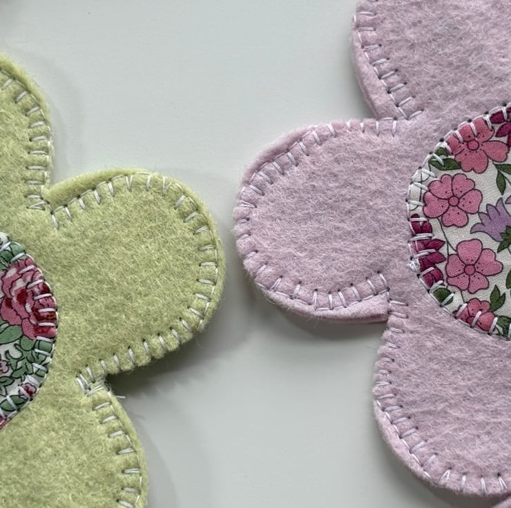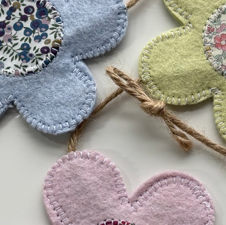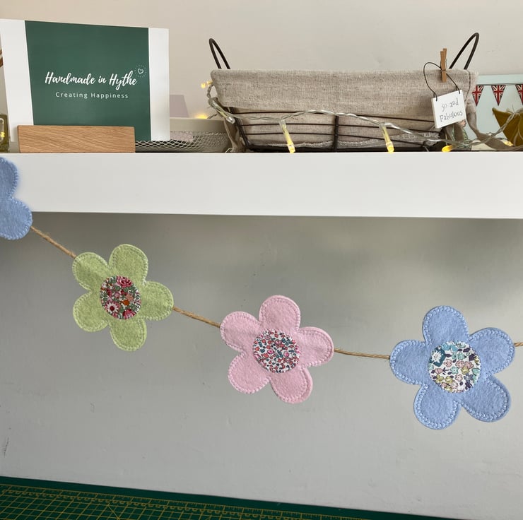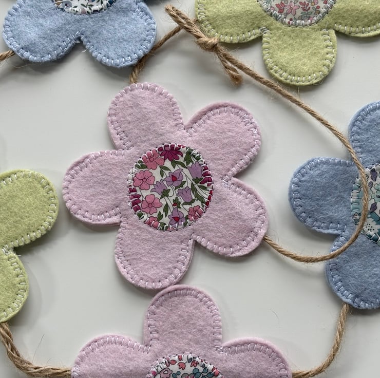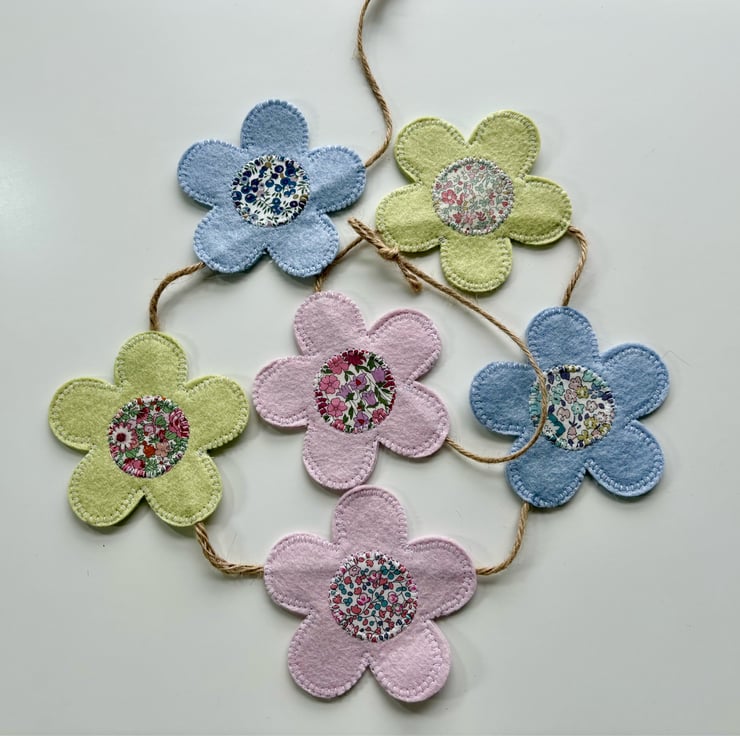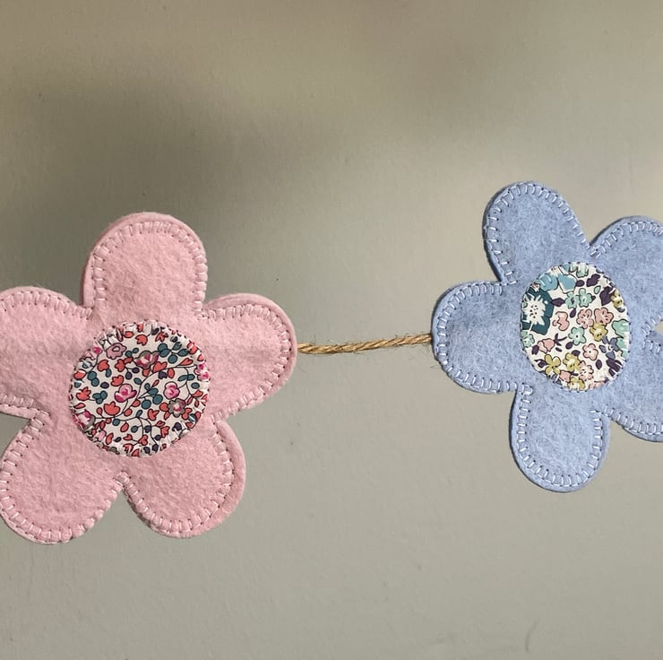 This pretty flower garland is handmade using pastel felt and Liberty print fabric.