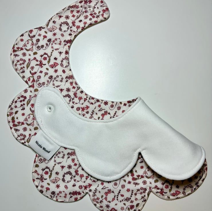 This gorgeous scalloped edge bib is handmade in pretty Liberty Tana Lawn fabric and would make a perfect new baby or baby shower gift.