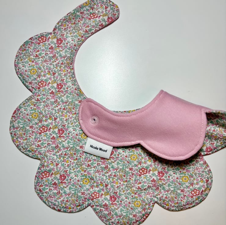 It is made from three layers of fabric, the beautiful cotton lawn, a cotton jersey backing and a middle layer of absorbent bamboo towelling. Top stitching around the edge adds a neat finish.