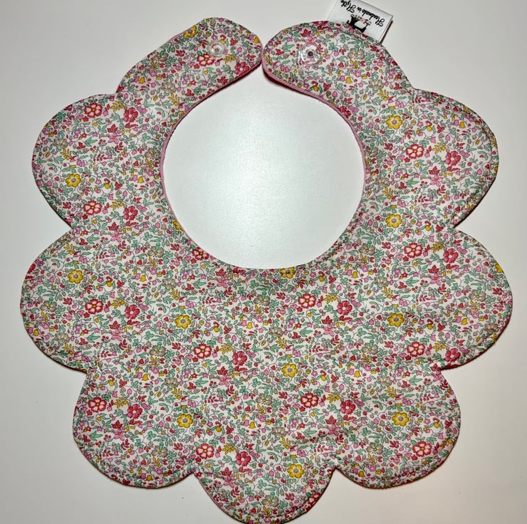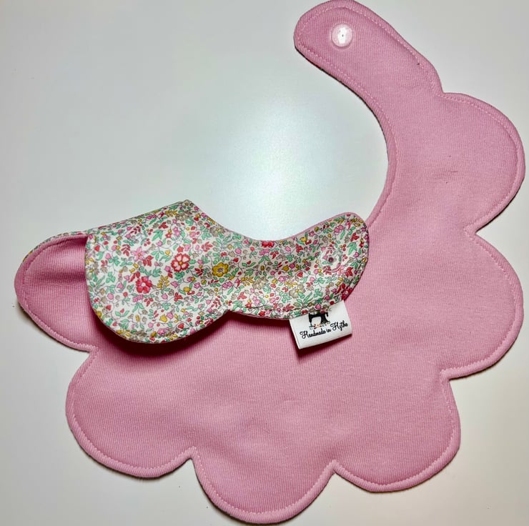 This gorgeous scalloped edge bib is handmade in pretty Liberty Tana Lawn fabric and would make a perfect new baby or baby shower gift.
