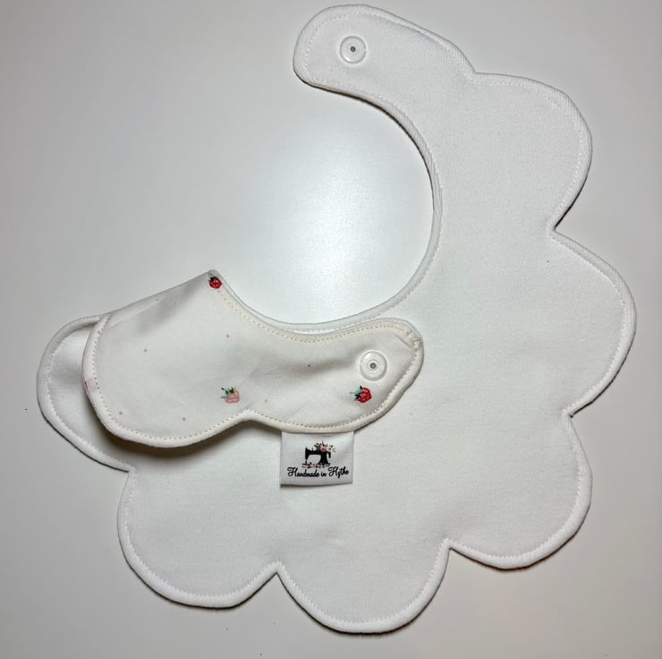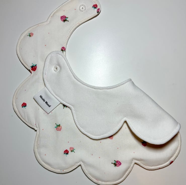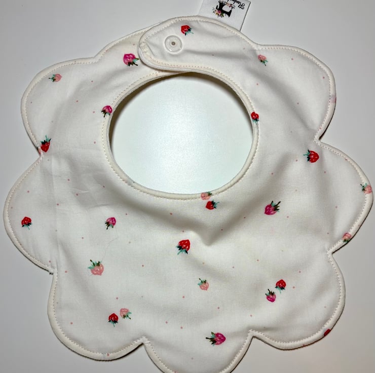 This gorgeous scalloped edge bib is handmade in a delicate strawberry print fabric and would make a perfect new baby or baby shower gift.
