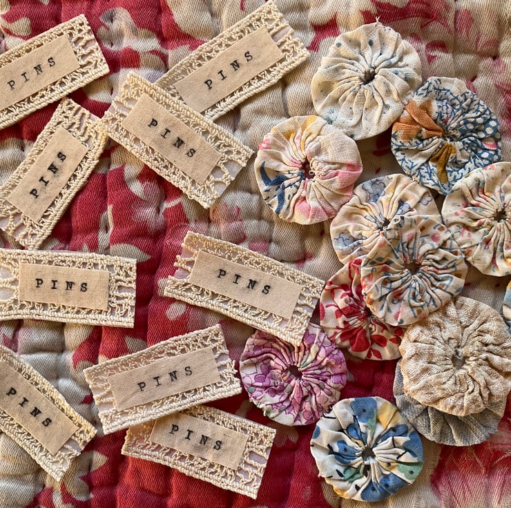 The Suffolk puffs have been attached to a base of antique French linen, which has also been used to back the pin cushion. On the reverse there is a typed ‘pins’ label mounted on to a piece of vintage lace.