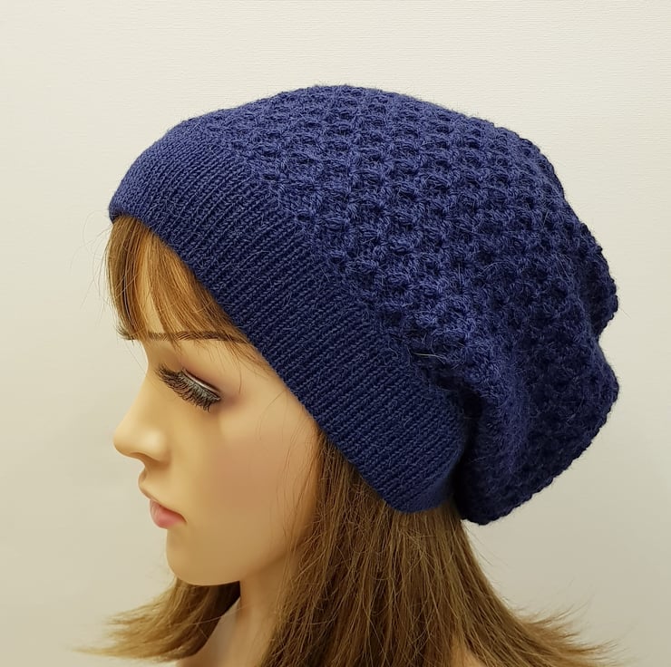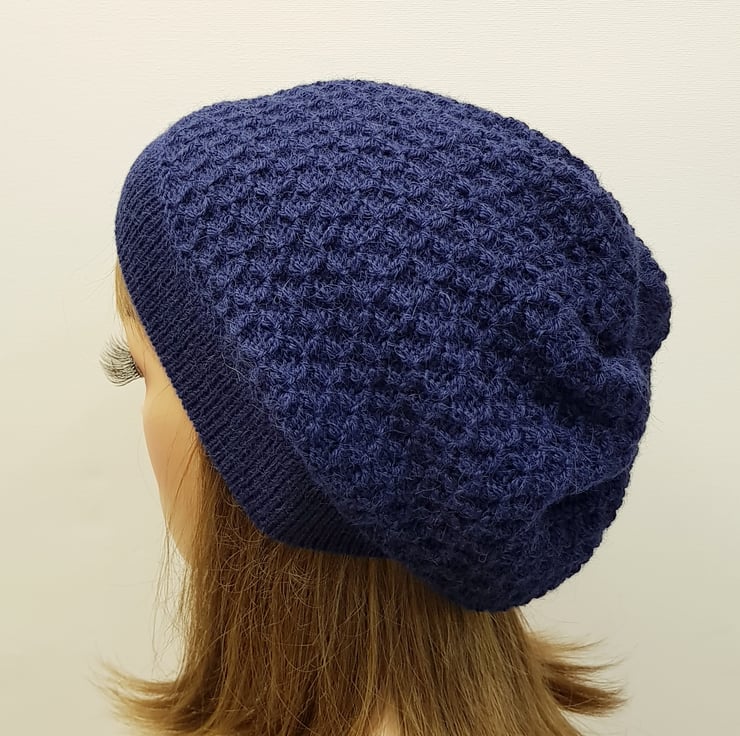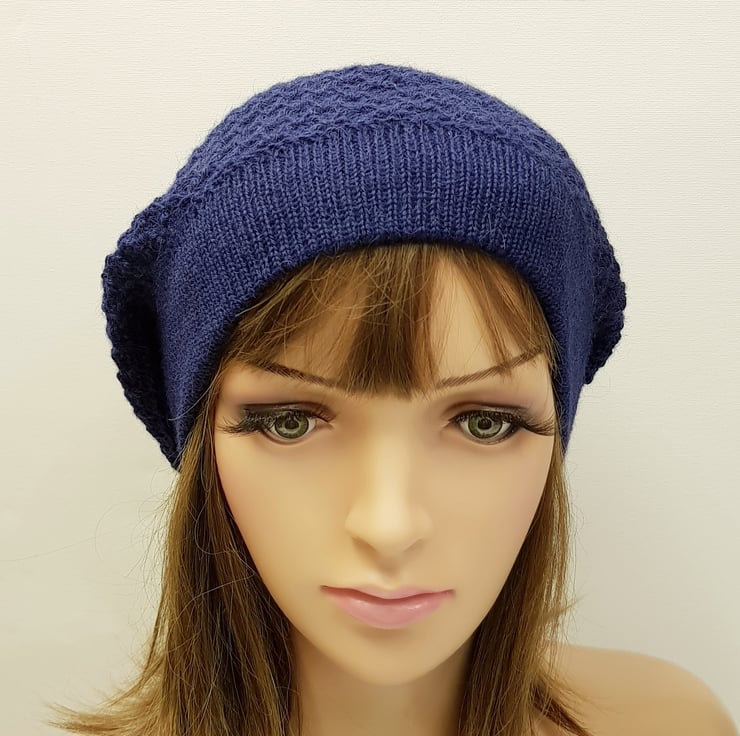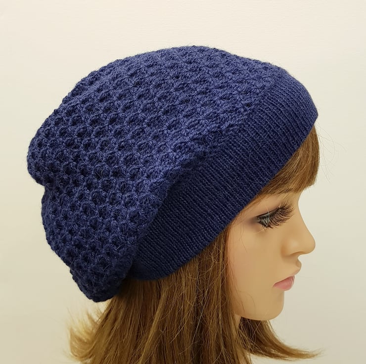 Alpaca beret for women, dark blue knitted baggy beanie, elegant tam.