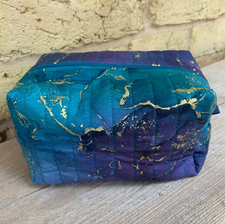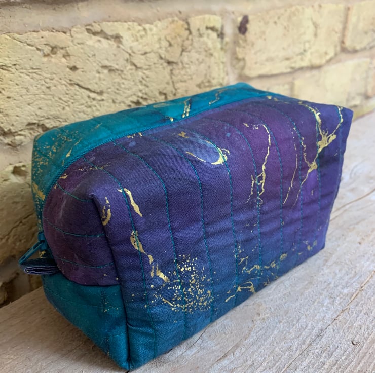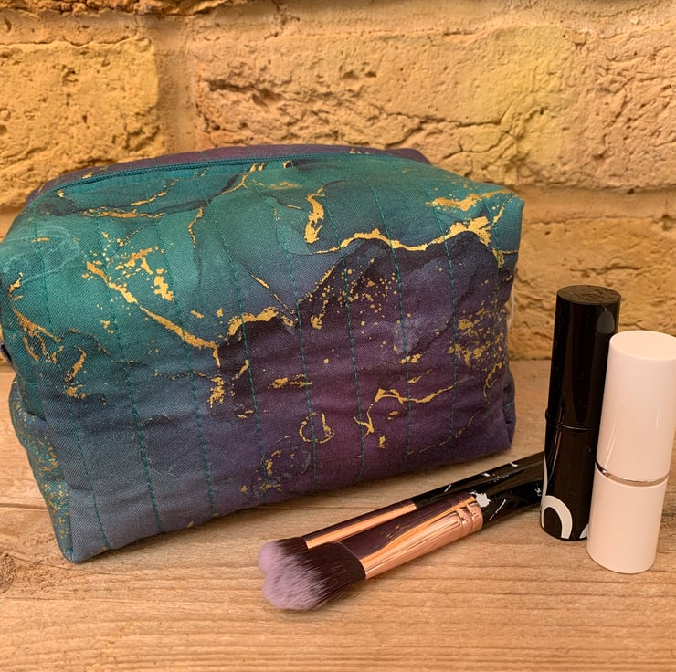 The Box shaped Makeup Bag has been made in stunning purple and jade colour cotton fabric with a gold marble effect.