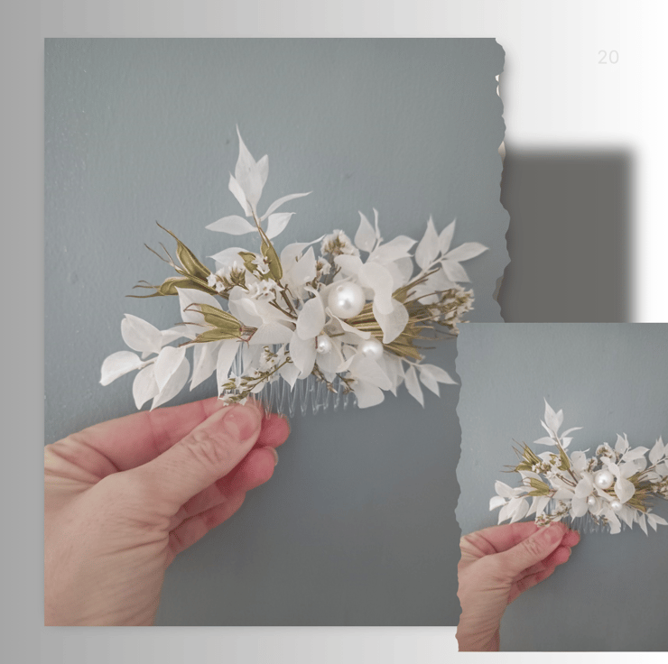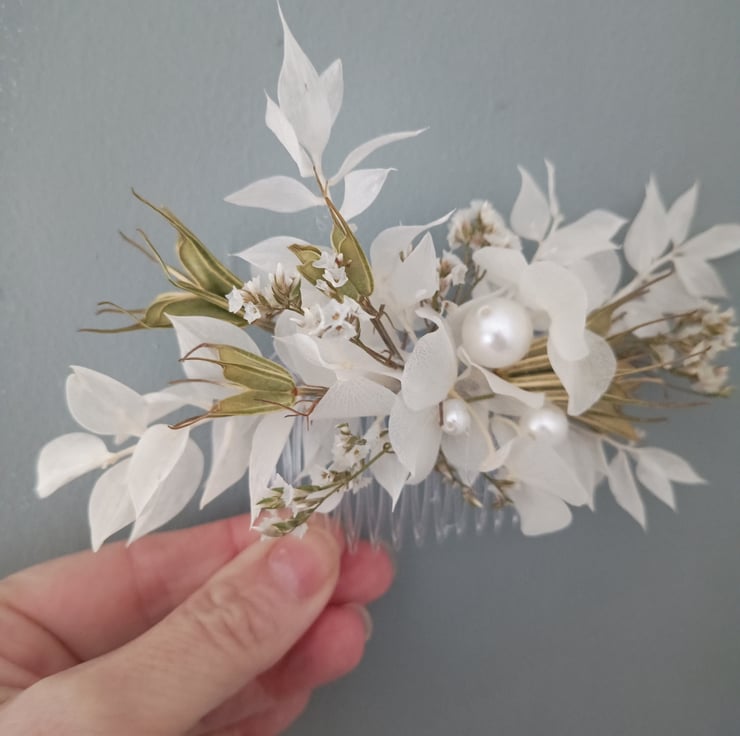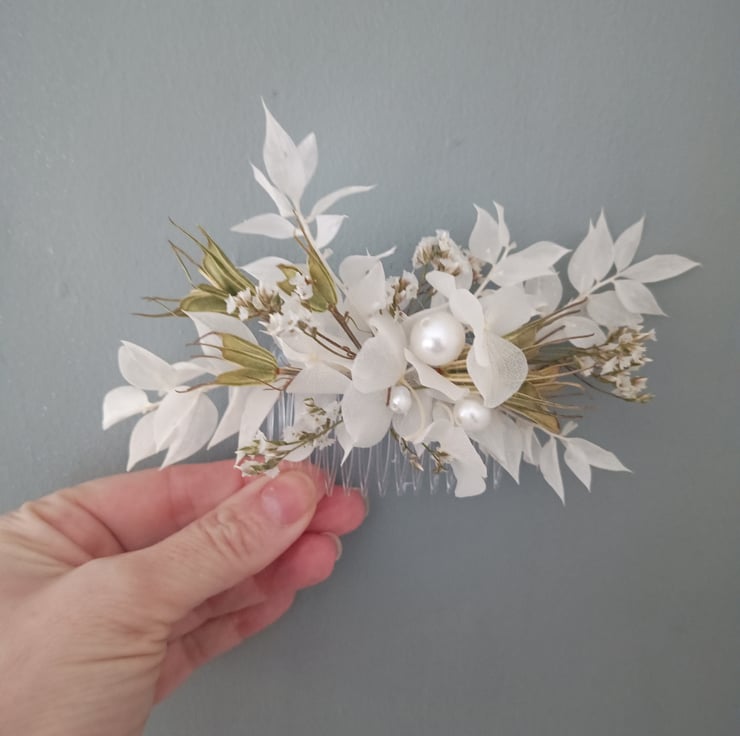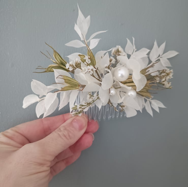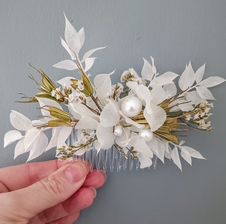 Elegant white dried flower hair comb. Perfect for brides, bridesmaids, proms and special occasions. Includes hydrangea, limonium, craspedia and pearls. Created on a clear plastic hair comb.