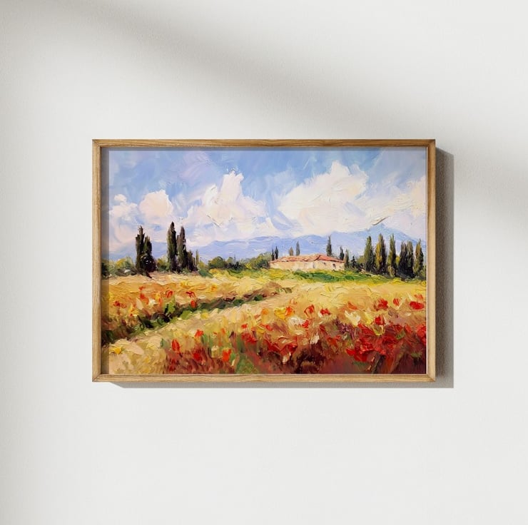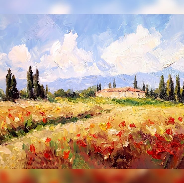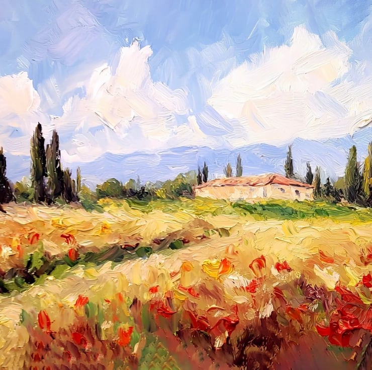 Golden fields stretch across the canvas, dotted with bright red poppies swaying in the breeze. Among them, a cozy farmhouse sits nestled between tall cypress trees, adding warmth and depth to the scene.