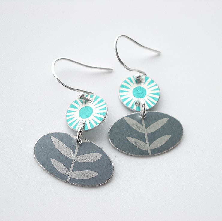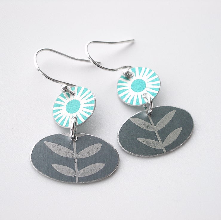 These flower and leaf earrings are inspired by scandi style folk art and are made from anodised aluminium which I have dyed in jade green and grey and printed with a leaf print. The dye is made permanent by heating the aluminium. I have cut out the circle and pod shape with a piercing saw and filed the edges for a nice smooth finish. The two pieces are linked with a sterling silver hoop and dangle from a sterling silver ear wire. The circle and pod shape together both measure approximately 25mm from top to bottom and the widest part of the pod measures 20mm across.