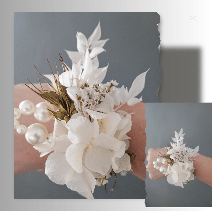 Elegant dried flower corsage perfect for weddings or proms. Matching gentleman's version is also available to purchase. Includes hydrangea, white ruscus, craspedia and pearls. Created on a pearl stretch bracelet so is suitable for all