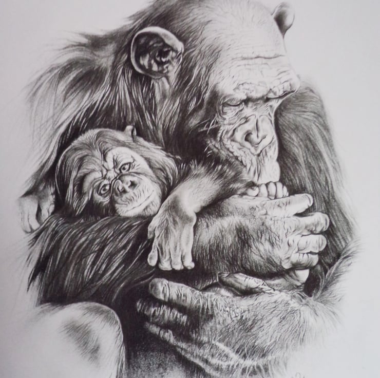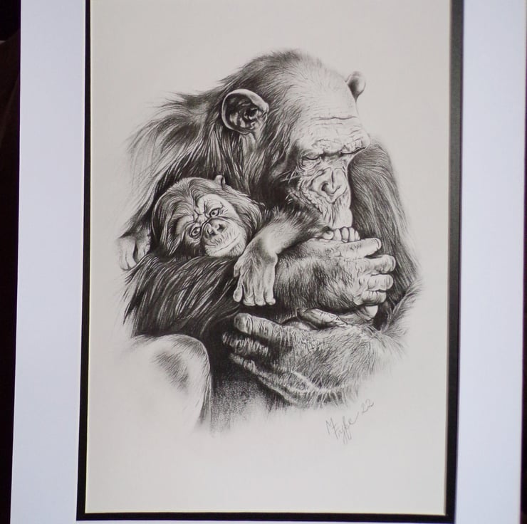 Giclee cotton smooth 300 gsm paper high quality print of chimpanzees (original is done in graphite)