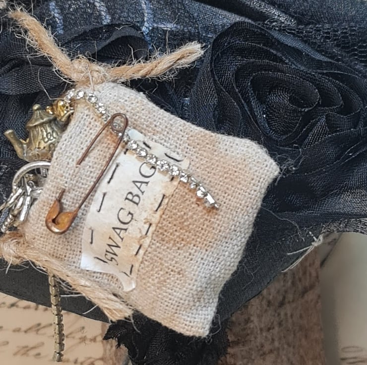 This wonderfully quirky fellow is made with unbleached cotton hand painted and embroidered with silver thread. He sports and elizabethan style ruffle sprinkled with tiny sequins. His swag bag is packed with the pretty shiny things he has found along his way.