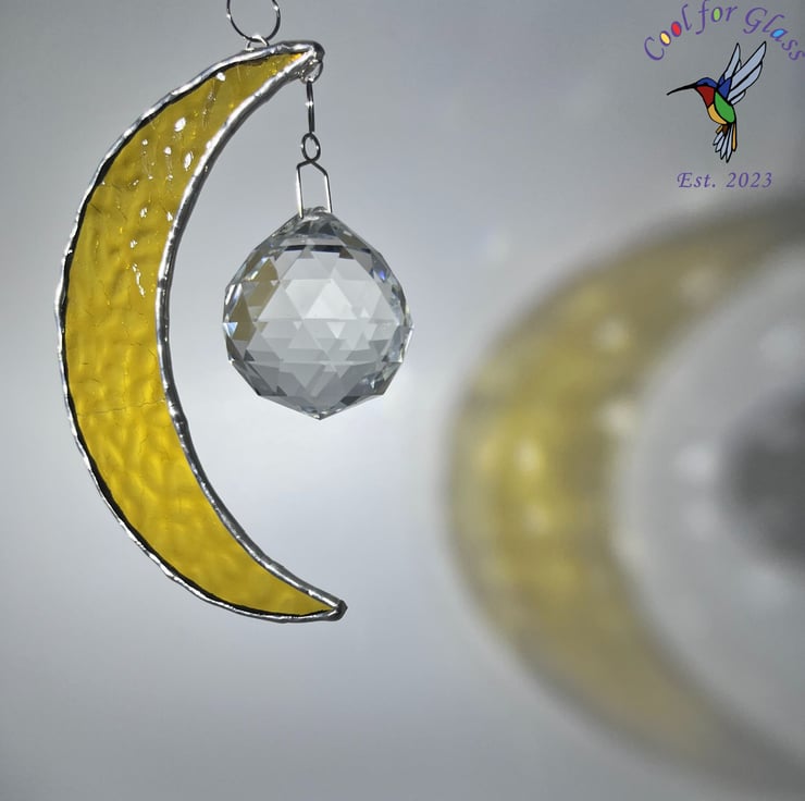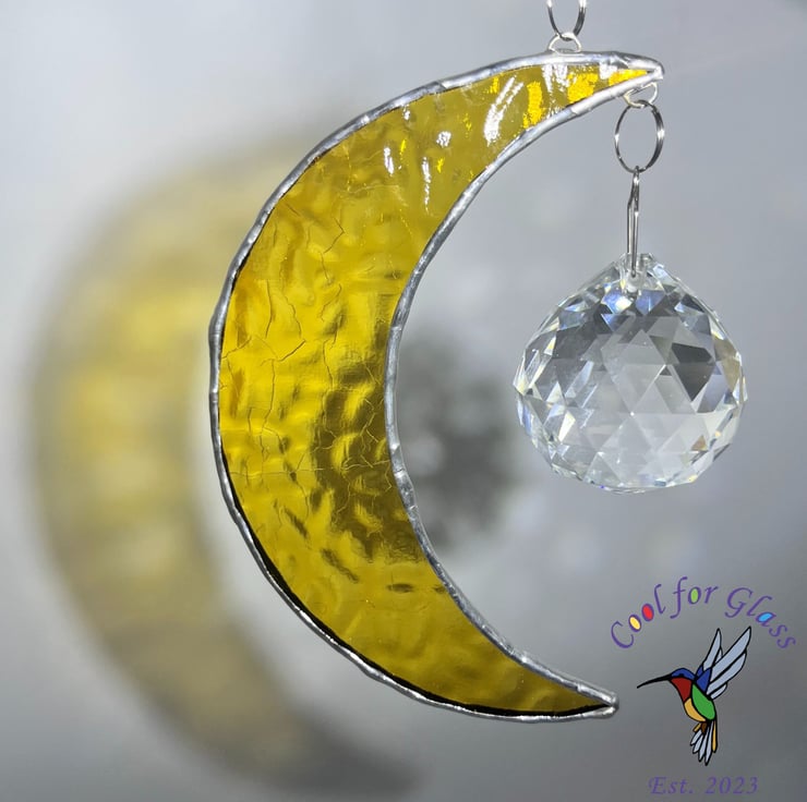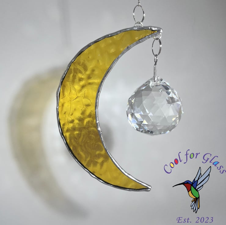 This Golden Crescent Moon suncatcher is a beautiful addition to any sunny room. It features a golden glass crescent moon framed in silver solder, with a hanging crystal prism that reflects light and creates colourful, playful displays. Perfect for adding a touch of elegance or mindfulness to windows or gardens, this suncatcher makes a unique and thoughtful gift.