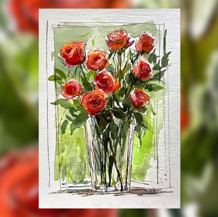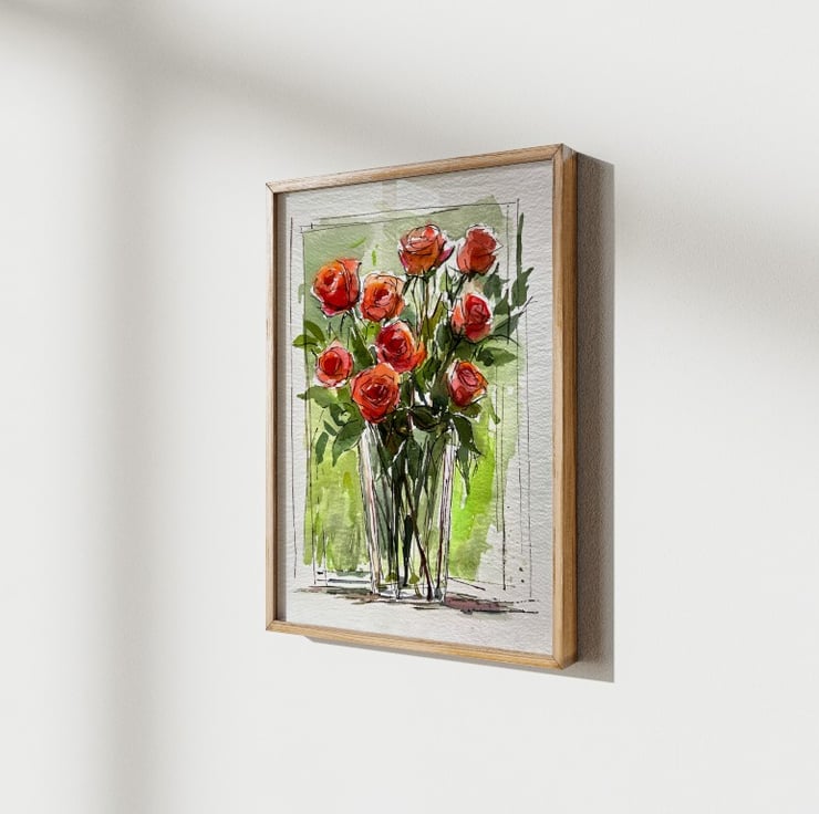 This rose bouquet watercolor painting captures the elegance and vibrancy of fresh roses in a glass vase. The artist skillfully blends rich red and orange hues with delicate green foliage, creating a lively composition full of movement. The loose ink outlines add a contemporary touch, enhancing the painting’s expressive quality.