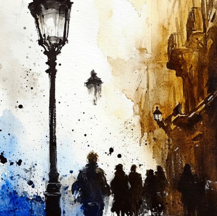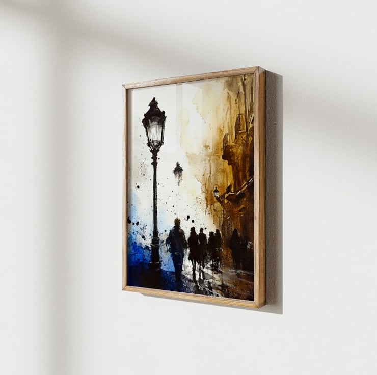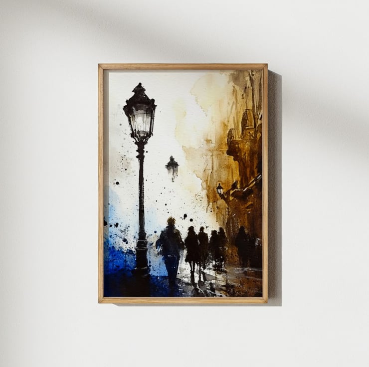 Perfect for those who love urban art, this painting makes a striking statement in modern or minimalist spaces. Whether placed in an office, living room, or gallery, it adds a unique sense of atmosphere and intrigue. Ultimately, with its dramatic lighting and flowing watercolor strokes, this artwork beautifully reflects the mystery and magic of city life.