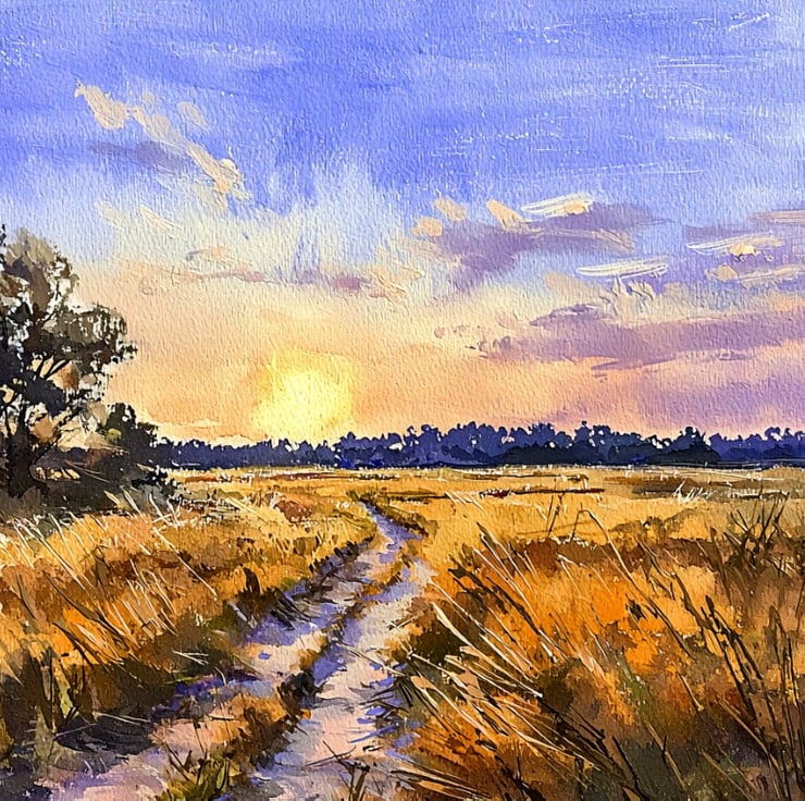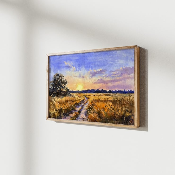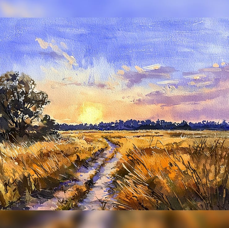 This Sunset Landscape watercolor painting beautifully captures the serene beauty of nature at dusk. The warm golden hues of the field contrast with the cool blues and purples of the sky, creating a stunning composition. A winding path meanders through the tall grasses, inviting the viewer to step into the peaceful countryside.