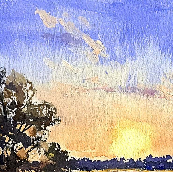 The artist’s use of expressive brushstrokes brings texture and depth to the scene. The delicate transition of colors in the sky mirrors the soft fading light, making this artwork feel both lively and calming. This piece is perfect for anyone who appreciates the beauty of nature and the tranquility of open landscapes.