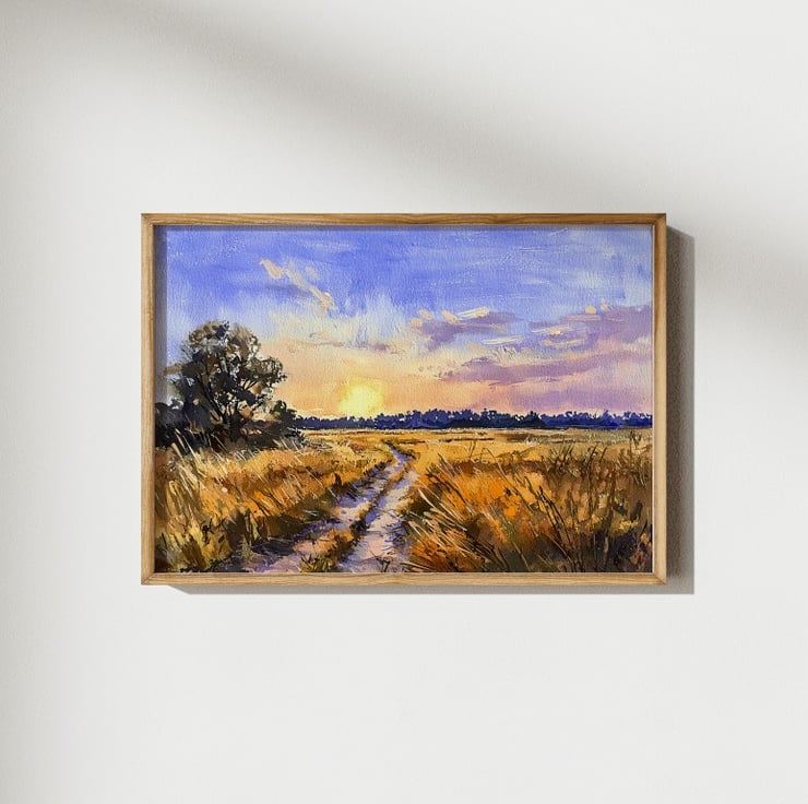 Ideal for home decor, this painting brings warmth and serenity to any space. Whether placed in a living room, office, or bedroom, it serves as a timeless reminder of nature’s quiet moments. Sunset Landscape is a must-have for lovers of impressionistic watercolor art.