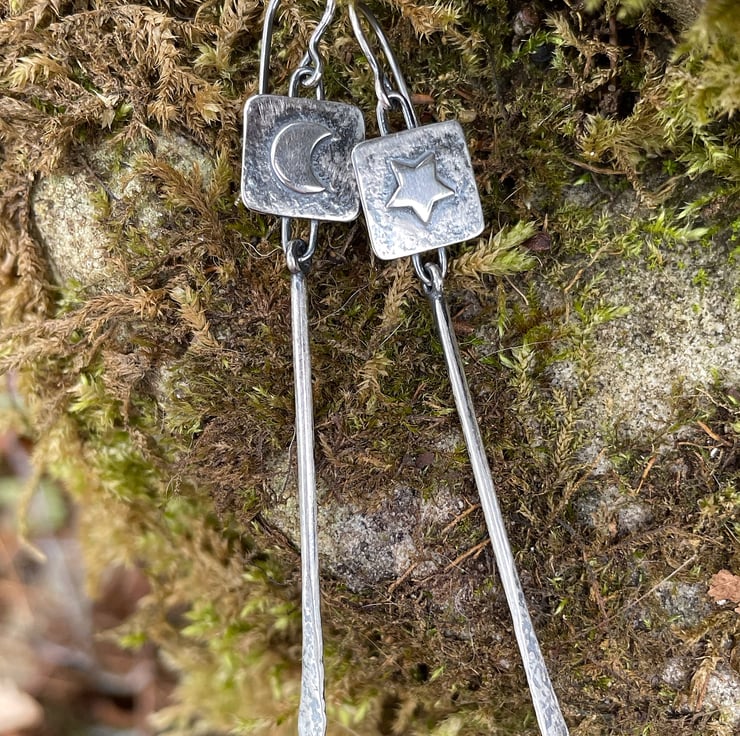 Small squares with raised star and moon hang from hand made hooks, below these hang long hammered pendulum dangles.