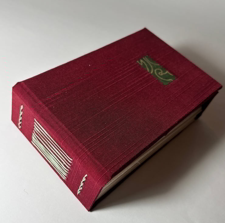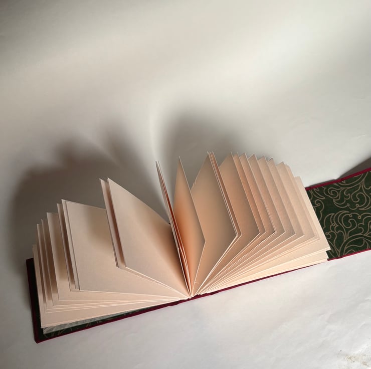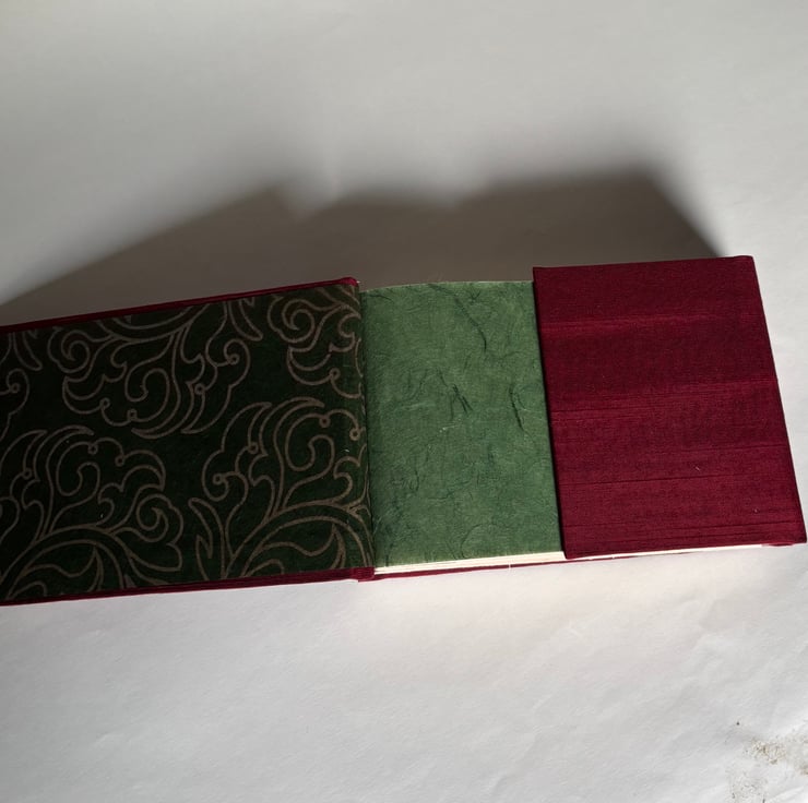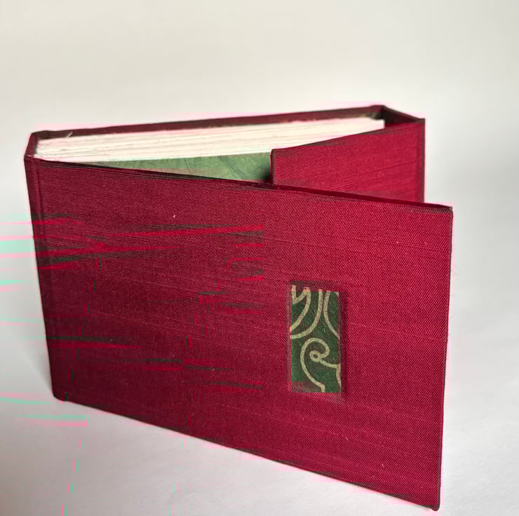 This one is a bit special: a foldover box-style book covered in luxuriant cherry red Japanese silk book cloth with a little inlay of green and gold paper. The inside covers are lined with the same green and gold handmade paper and the first page is of delicate green and the second of pale cream handmade paper. Then you come to many pages of lovely Fabriano paper (Unica Cream, 250gsm), which are perfect for sketching, watercolour painting as well as writing. This book comes in its own presentation box: the book measures 16x10.5x4cm and the box measures 24x17.5x5.