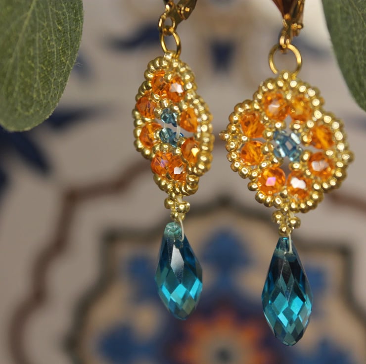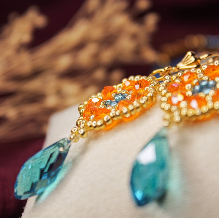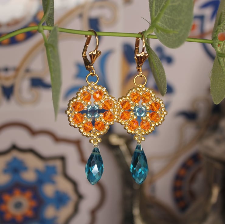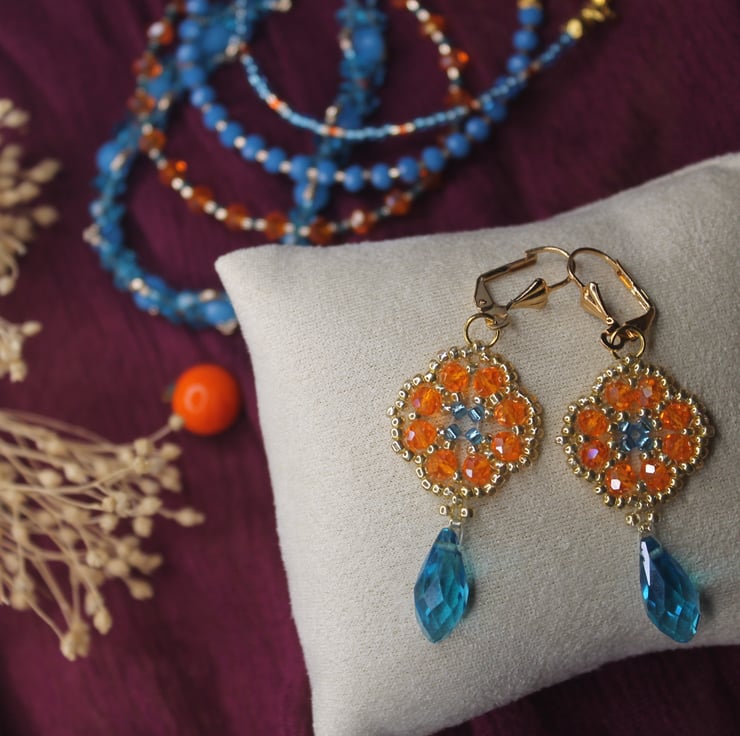 These earrings feature faceted orange crystal beads that catch the light beautifully, combined with blue and gold seed beads. A dangling sky-blue teardrop adds a touch of grace, echoing the bright Andalusian sky. The hooks are made of stainless steel, ensuring durability and comfort