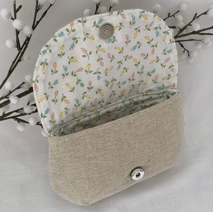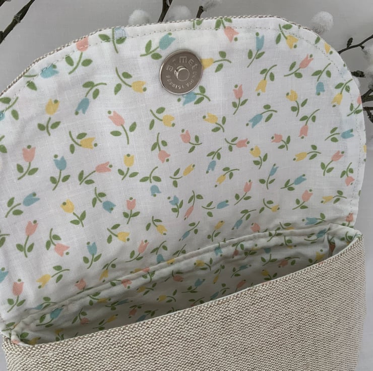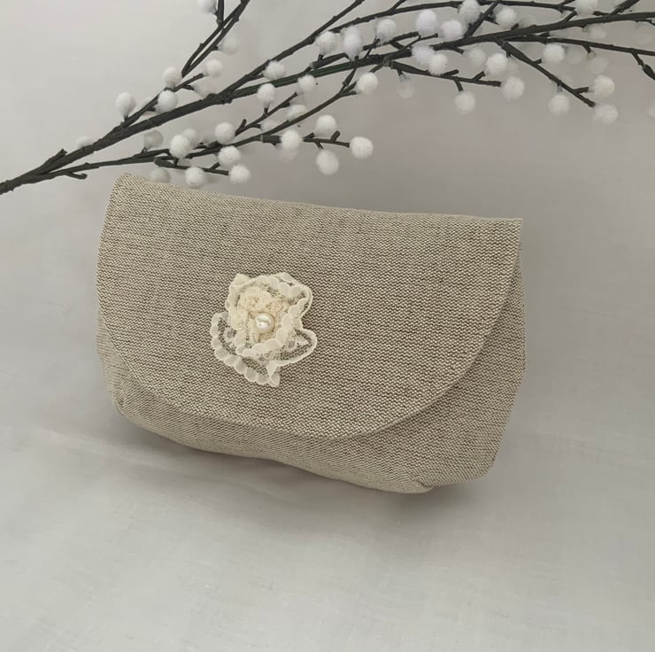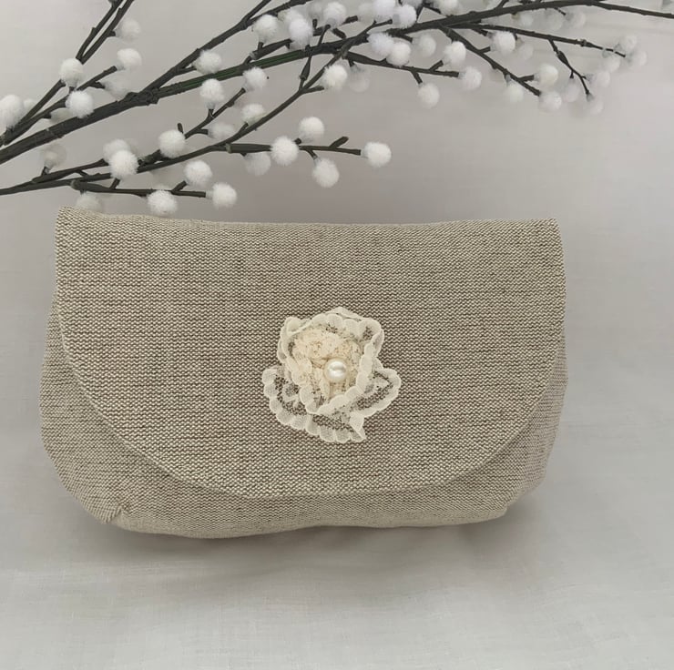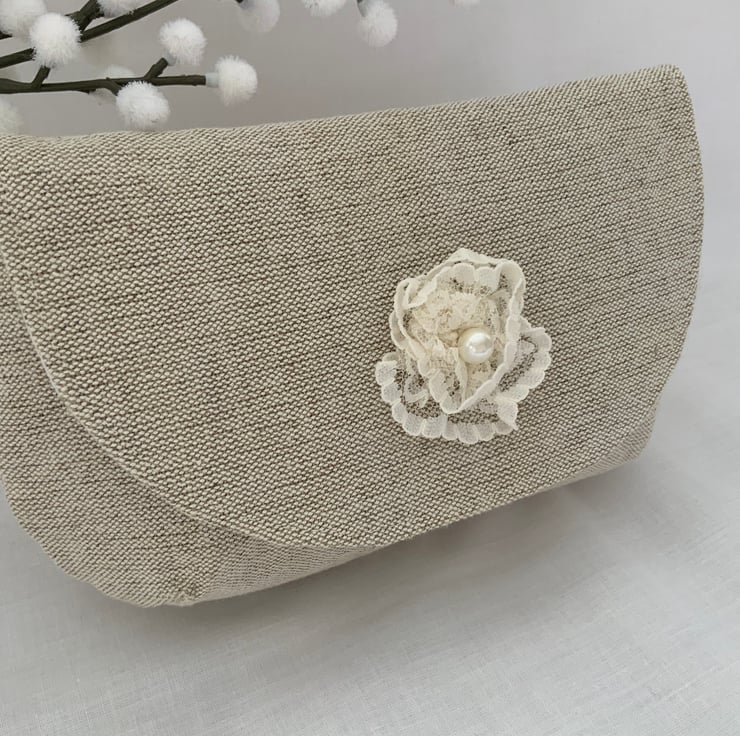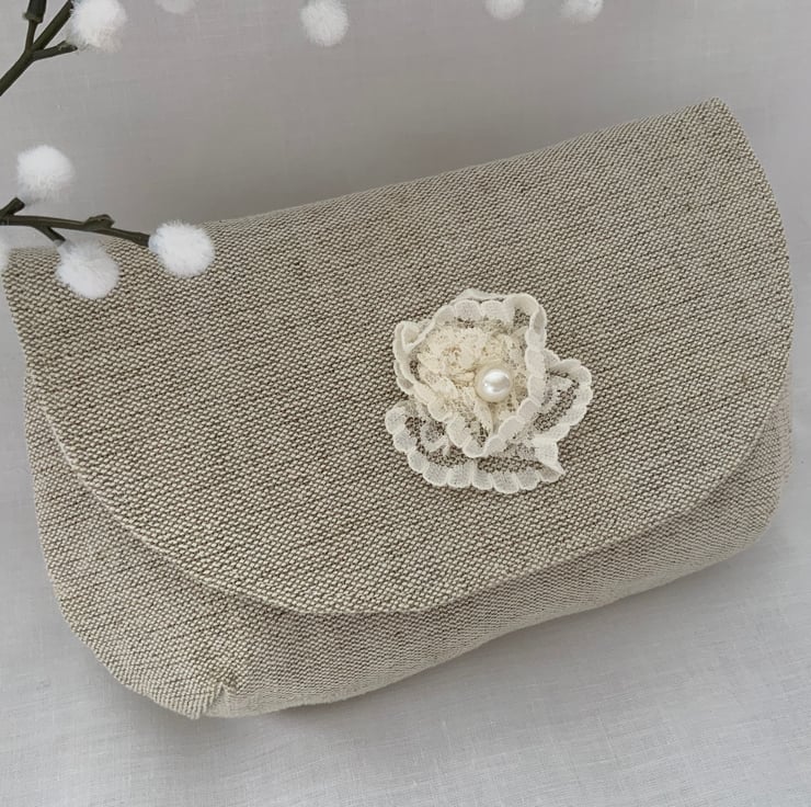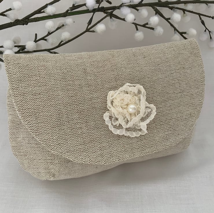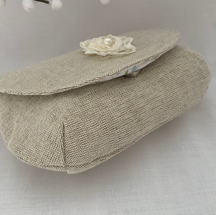 Beautiful small linen clutch bag decorated with a handmade lace flower with pearl bead centre. Internally, it is interfaced and lined in vintage floral fabric. The bag is fastened with a magnetic snap.