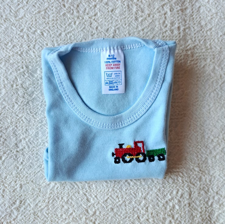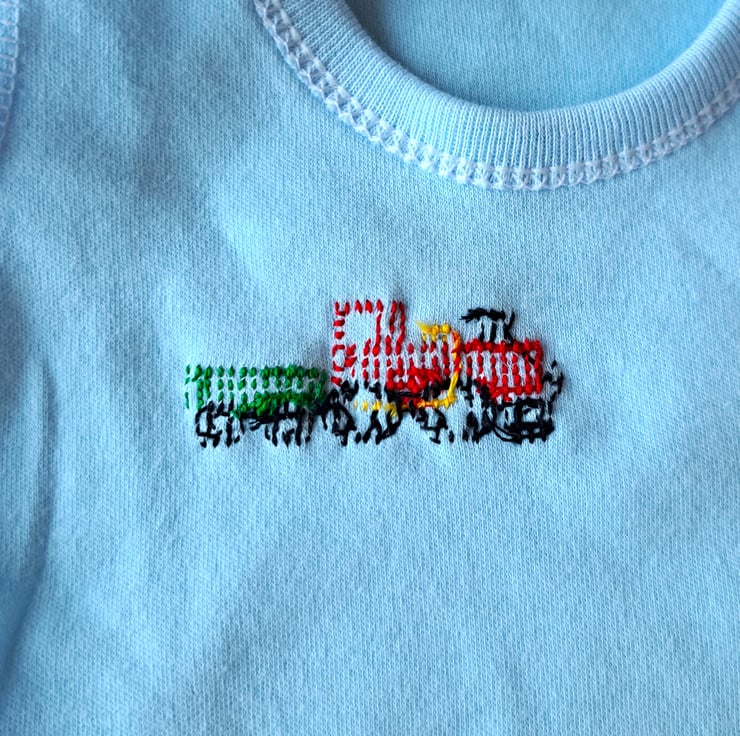 What a lovely gift for a tiny boy! I have hand embroidered a red toy engine pulling a dark green truck on the left front of this soft, pale blue cotton T-shirt. The shirt has short sleeves and a round neck. All the edges, hem, sleeves and neck, are bound with matching ribbing. As I never use a permanent backing material when embroidering kids' clothing, there is nothing inside to irritate your baby's skin. The shirt is machine washable.